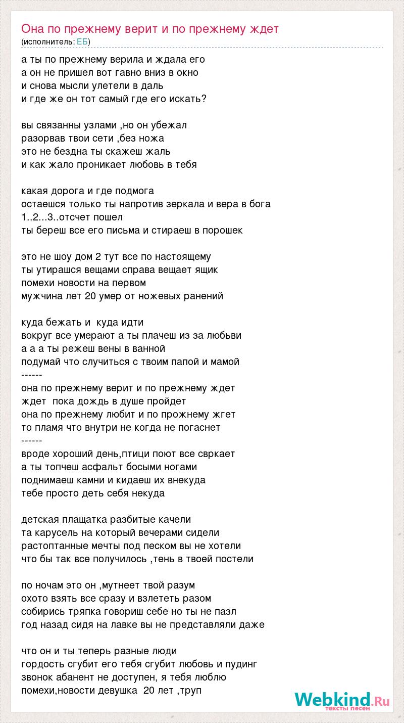 а ты по прежнему верила и ждала его а он не пришел вот гавно вниз в окно и снова мысли улетели в даль и где же он тот самый где его искать? вы связанны узлами ,но он убежал разорвав твои сети ,без ножа это не бездна ты скажеш жаль и как жало проникает любовь в тебя какая дорога и где подмога остаешся только ты напротив зеркала и вера в бога 1..2...3..отсчет пошел ты береш все его письма и стираеш в порошек это не шоу дом 2 тут все по настоящему ты утирашся вещами справа вещает ящик помехи новости на первом мужчина лет 20 умер от ножевых ранений куда бежать и куда идти вокруг все умерают а ты плачеш из за любьви а а а ты режеш вены в ванной подумай что случиться с твоим папой и мамой ------ она по прежнему верит и по прежнему ждет ждет пока дождь в душе пройдет она по прежнему любит и по прожнему жгет то пламя что внутри не когда не погаснет ------ вроде хороший день,птици поют все свркает а ты топчеш асфальт босыми ногами поднимаеш камни и кидаеш их внекуда тебе просто деть себя некуда детская плащатка разбитые качели та карусель на который вечерами сидели растоптанные мечты под песком вы не хотели что бы так все получилось ,тень в твоей постели по ночам это он ,мутнеет твой разум охото взять все сразу и взлететь разом собирись тряпка говориш себе но ты не пазл год назад сидя на лавке вы не представляли даже что он и ты теперь разные люди гордость сгубит его тебя сгубит любовь и пудинг звонок абанент не доступен, я тебя люблю помехи,новости девушка 20 лет ,труп