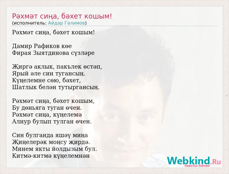 Рәхмәт сиңа, бәхет кошым! Дамир Рафиков көе Фирая Зыятдинова сүзләре Җиргә аклык, пакълек өстәп, Ярый әле син тугансың. Күңелемне сөю, бәхет, Шатлык белән тутыргансың. Рәхмәт сиңа, бәхет кошым, Бу дөньяга туган өчен. Рәхмәт сиңа, күңелемә Алнур булып тулган өчен. Син булганда яшәү миңа Җиңелерәк моңсу җирдә. Минем якты йолдызым бул. Китмә-китмә күңелемнән