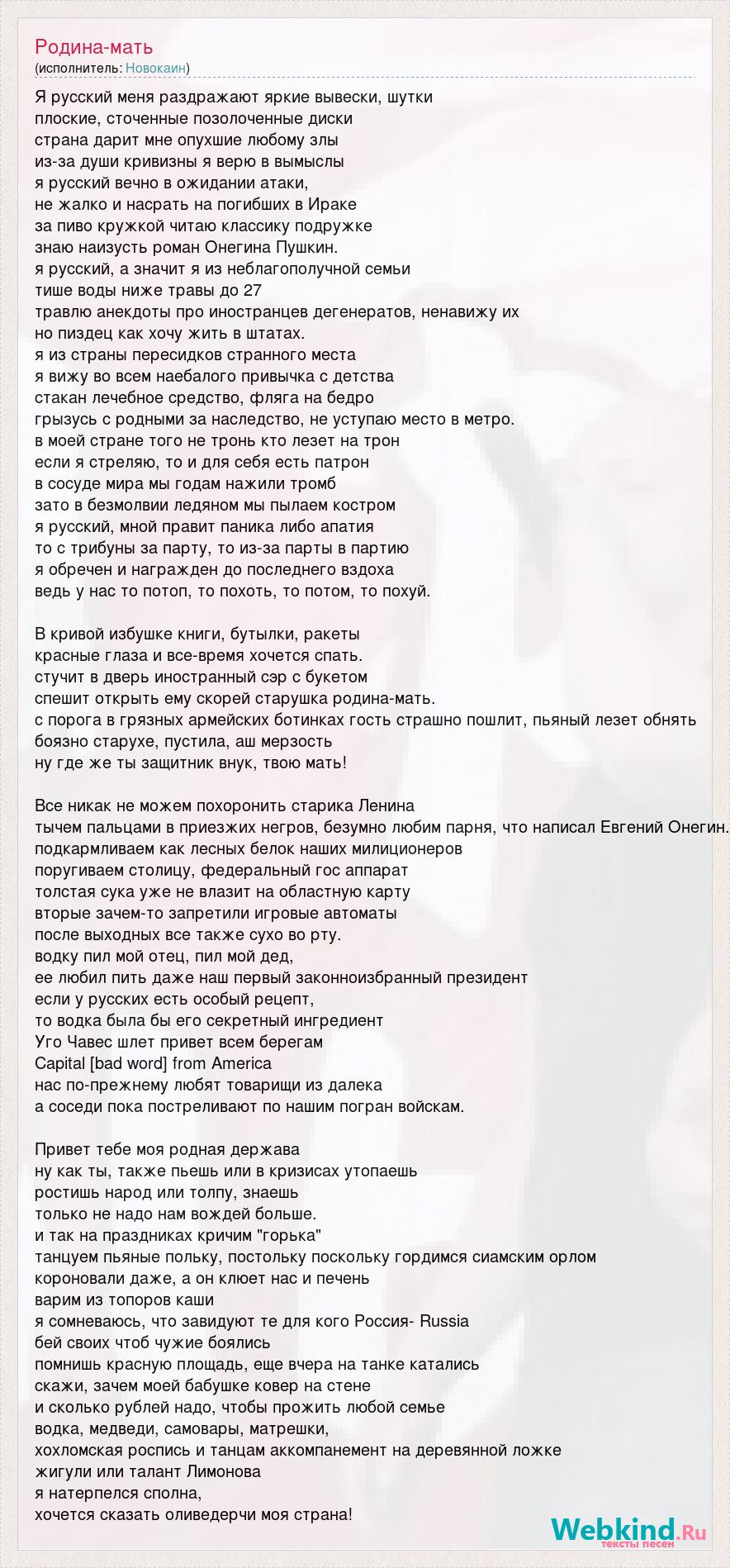 Я русский меня раздражают яркие вывески, шутки плоские, сточенные позолоченные диски страна дарит мне опухшие любому злы из-за души кривизны я верю в вымыслы я русский вечно в ожидании атаки, не жалко и насрать на погибших в Ираке за пиво кружкой читаю классику подружке знаю наизусть роман Онегина Пушкин. я русский, а значит я из неблагополучной семьи тише воды ниже травы до 27 травлю анекдоты про иностранцев дегенератов, ненавижу их но пиздец как хочу жить в штатах. я из страны пересидков странного места я вижу во всем наебалого привычка с детства стакан лечебное средство, фляга на бедро грызусь с родными за наследство, не уступаю место в метро. в моей стране того не тронь кто лезет на трон если я стреляю, то и для себя есть патрон в сосуде мира мы годам нажили тромб зато в безмолвии ледяном мы пылаем костром я русский, мной правит паника либо апатия то с трибуны за парту, то из-за парты в партию я обречен и награжден до последнего вздоха ведь у нас то потоп, то похоть, то потом, то похуй. В кривой избушке книги, бутылки, ракеты красные глаза и все-время хочется спать. стучит в дверь иностранный сэр с букетом спешит открыть ему скорей старушка родина-мать. с порога в грязных армейских ботинках гость страшно пошлит, пьяный лезет обнять боязно старухе, пустила, аш мерзость ну где же ты защитник внук, твою мать! Все никак не можем похоронить старика Ленина тычем пальцами в приезжих негров, безумно любим парня, что написал Евгений Онегин. подкармливаем как лесных белок наших милиционеров поругиваем столицу, федеральный гос аппарат толстая сука уже не влазит на областную карту вторые зачем-то запретили игровые автоматы после выходных все также сухо во рту. водку пил мой отец, пил мой дед, ее любил пить даже наш первый законноизбранный президент если у русских есть особый рецепт, то водка была бы его секретный ингредиент Уго Чавес шлет привет всем берегам Capital [bad word] from America нас по-прежнему любят товарищи из далека а соседи пока постреливают по нашим погран войскам. Привет тебе моя родная держава ну как ты, также пьешь или в кризисах утопаешь ростишь народ или толпу, знаешь только не надо нам вождей больше. и так на праздниках кричим "горька" танцуем пьяные польку, постольку поскольку гордимся сиамским орлом короновали даже, а он клюет нас и печень варим из топоров каши я сомневаюсь, что завидуют те для кого Россия- Russia бей своих чтоб чужие боялись помнишь красную площадь, еще вчера на танке катались скажи, зачем моей бабушке ковер на стене и сколько рублей надо, чтобы прожить любой семье водка, медведи, самовары, матрешки, хохломская роспись и танцам аккомпанемент на деревянной ложке жигули или талант Лимонова я натерпелся сполна, хочется сказать оливедерчи моя страна!