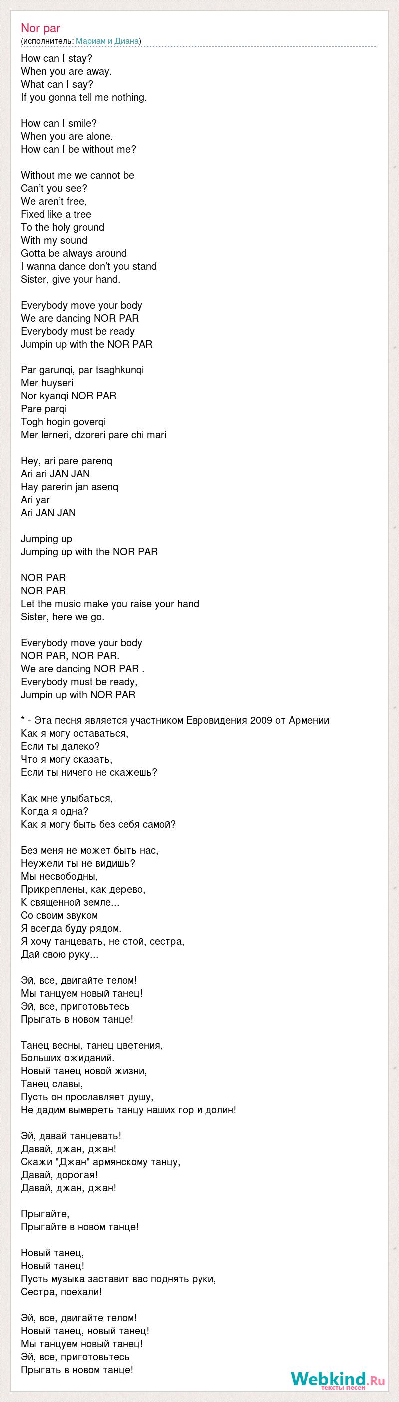 How can I stay? When you are away. What can I say? If you gonna tell me nothing. How can I smile? When you are alone. How can I be without me? Without me we cannot be Can’t you see? We aren’t free, Fixed like a tree To the holy ground With my sound Gotta be always around I wanna dance don’t you stand Sister, give your hand. Everybody move your body We are dancing NOR PAR Everybody must be ready Jumpin up with the NOR PAR Par garunqi, par tsaghkunqi Mer huyseri Nor kyanqi NOR PAR Pare parqi Togh hogin goverqi Mer lerneri, dzoreri pare chi mari Hey, ari pare parenq Ari ari JAN JAN Hay parerin jan asenq Ari yar Ari JAN JAN Jumping up Jumping up with the NOR PAR NOR PAR NOR PAR Let the music make you raise your hand Sister, here we go. Everybody move your body NOR PAR, NOR PAR. We are dancing NOR PAR . Everybody must be ready, Jumpin up with NOR PAR * - Эта песня является участником Евровидения 2009 от Армении Как я могу оставаться, Если ты далеко? Что я могу сказать, Если ты ничего не скажешь? Как мне улыбаться, Когда я одна? Как я могу быть без себя самой? Без меня не может быть нас, Неужели ты не видишь? Мы несвободны, Прикреплены, как дерево, К священной земле... Со своим звуком Я всегда буду рядом. Я хочу танцевать, не стой, сестра, Дай свою руку... Эй, все, двигайте телом! Мы танцуем новый танец! Эй, все, приготовьтесь Прыгать в новом танце! Танец весны, танец цветения, Больших ожиданий. Новый танец новой жизни, Танец славы, Пусть он прославляет душу, Не дадим вымереть танцу наших гор и долин! Эй, давай танцевать! Давай, джан, джан! Скажи "Джан" армянскому танцу, Давай, дорогая! Давай, джан, джан! Прыгайте, Прыгайте в новом танце! Новый танец, Новый танец! Пусть музыка заставит вас поднять руки, Сестра, поехали! Эй, все, двигайте телом! Новый танец, новый танец! Мы танцуем новый танец! Эй, все, приготовьтесь Прыгать в новом танце!