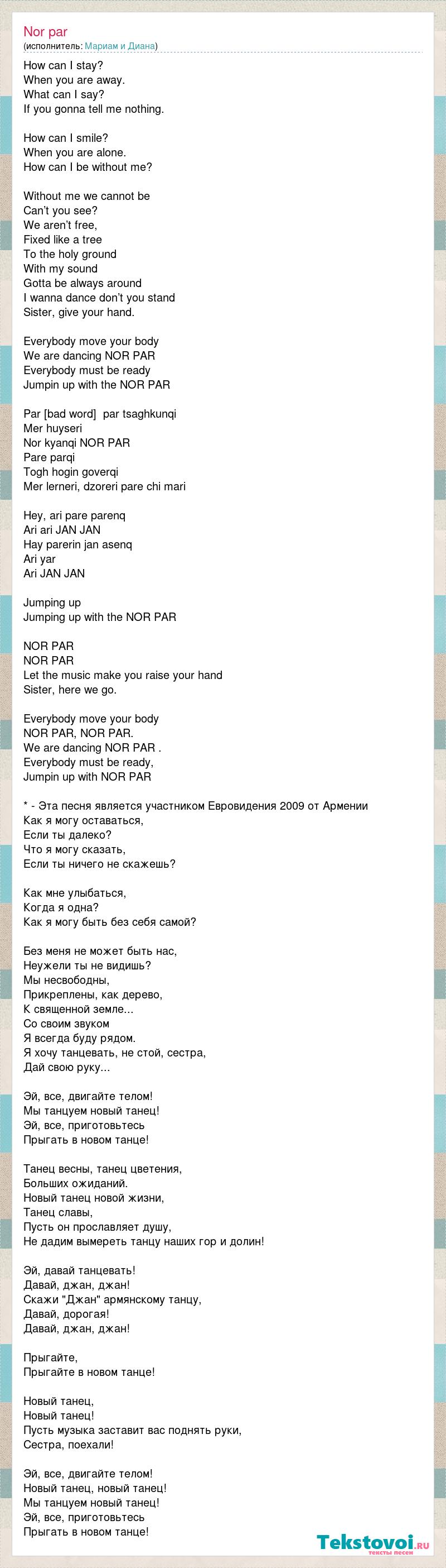 How can I stay? When you are away. What can I say? If you gonna tell me nothing. How can I smile? When you are alone. How can I be without me? Without me we cannot be Can’t you see? We aren’t free, Fixed like a tree To the holy ground With my sound Gotta be always around I wanna dance don’t you stand Sister, give your hand. Everybody move your body We are dancing NOR PAR Everybody must be ready Jumpin up with the NOR PAR Par garunqi, par tsaghkunqi Mer huyseri Nor kyanqi NOR PAR Pare parqi Togh hogin goverqi Mer lerneri, dzoreri pare chi mari Hey, ari pare parenq Ari ari JAN JAN Hay parerin jan asenq Ari yar Ari JAN JAN Jumping up Jumping up with the NOR PAR NOR PAR NOR PAR Let the music make you raise your hand Sister, here we go. Everybody move your body NOR PAR, NOR PAR. We are dancing NOR PAR . Everybody must be ready, Jumpin up with NOR PAR * - Эта песня является участником Евровидения 2009 от Армении Как я могу оставаться, Если ты далеко? Что я могу сказать, Если ты ничего не скажешь? Как мне улыбаться, Когда я одна? Как я могу быть без себя самой? Без меня не может быть нас, Неужели ты не видишь? Мы несвободны, Прикреплены, как дерево, К священной земле... Со своим звуком Я всегда буду рядом. Я хочу танцевать, не стой, сестра, Дай свою руку... Эй, все, двигайте телом! Мы танцуем новый танец! Эй, все, приготовьтесь Прыгать в новом танце! Танец весны, танец цветения, Больших ожиданий. Новый танец новой жизни, Танец славы, Пусть он прославляет душу, Не дадим вымереть танцу наших гор и долин! Эй, давай танцевать! Давай, джан, джан! Скажи "Джан" армянскому танцу, Давай, дорогая! Давай, джан, джан! Прыгайте, Прыгайте в новом танце! Новый танец, Новый танец! Пусть музыка заставит вас поднять руки, Сестра, поехали! Эй, все, двигайте телом! Новый танец, новый танец! Мы танцуем новый танец! Эй, все, приготовьтесь Прыгать в новом танце!