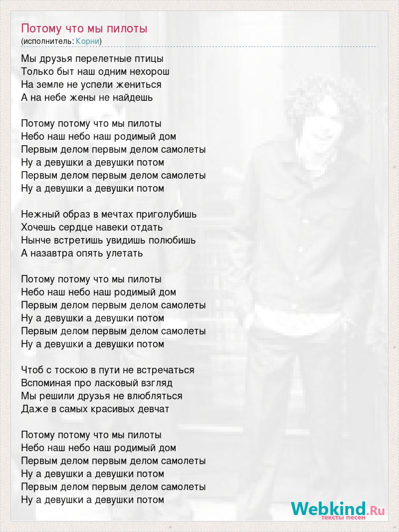 Мы друзья перелетные птицы Только быт наш одним нехорош На земле не успели жениться А на небе жены не найдешь Потому потому что мы пилоты Небо наш небо наш родимый дом Первым делом первым делом самолеты Ну а девушки а девушки потом Первым делом первым делом самолеты Ну а девушки а девушки потом Нежный образ в мечтах приголубишь Хочешь сердце навеки отдать Нынче встретишь увидишь полюбишь А назавтра опять улетать Потому потому что мы пилоты Небо наш небо наш родимый дом Первым делом первым делом самолеты Ну а девушки а девушки потом Первым делом первым делом самолеты Ну а девушки а девушки потом Чтоб с тоскою в пути не встречаться Вспоминая про ласковый взгляд Мы решили друзья не влюбляться Даже в самых красивых девчат Потому потому что мы пилоты Небо наш небо наш родимый дом Первым делом первым делом самолеты Ну а девушки а девушки потом Первым делом первым делом самолеты Ну а девушки а девушки потом
