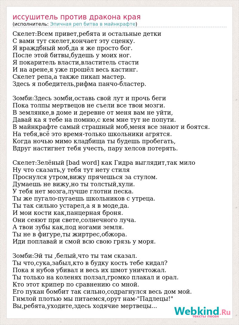 Скелет:Всем привет,ребята и остальные детки С вами тут скелет,кончает эту сценку. Я враждбный моб,да я же просто бог. После этой битвы,будешь у моих ног. Я покаритель власти,властитель стасти И на арене,я уже прошёл весь кастинг. Скелет репа,а также пикап мастер. Здесь я победитель,рифма панчо-бластер. Зомби:Здесь зомби,оставь свой лут и прочь беги Пока толпы мертвецов не съели все твои мозги. В землянке,в доме и деревне от меня вам не уйти, Давай ка я тебе на помню,с кем мне тут не попути. В майнкрафте самый страшный моб,меня все знают и боятся. На тебя,всё это время-только школьники агрятся. Когда ночью мимо кладбища ты будешь пробегать, Вдруг настигнет тебя учесть, пару хелсов потерять. Скелет:Зелёный [bad word] как Гидра выглядит,так мило Ну что сказать,у тебя тут нету стиля Проснулся утром,вижу прячешься за стулом. Думаешь не вижу,но ты толстый,хули. У тебя нет мозга,лучше глотни песка. Ты же пугало-пугаешь школьников с утреца. Ты так сильно устарел,а я в моде,да. И мои кости как,панцерная броня. Они сеяют при свете,солнечного луча. А твои зубы как,под ногами земля. Ты не в фигуре,ты жиртрес,обжора. Иди поплавай и смой всю свою грязь у моря. Зомби:Эй ты ,белый,что ты там сказал. Ты что,сука,забыл,кто в будку кость тебе кидал? Пока я нубов убивал и весь их шмот уничтожал. Ты только на коленях ползал,громко плакал и орал. Кто этот крипер по сравнению со мной. Его пукан бомбит так сильно,содрагнулся весь дом мой. Гнмлой плотью мы питаемся,орут нам-"Падлецы!" Вы,ребята,уходите,здесь ходячие мертвецы...