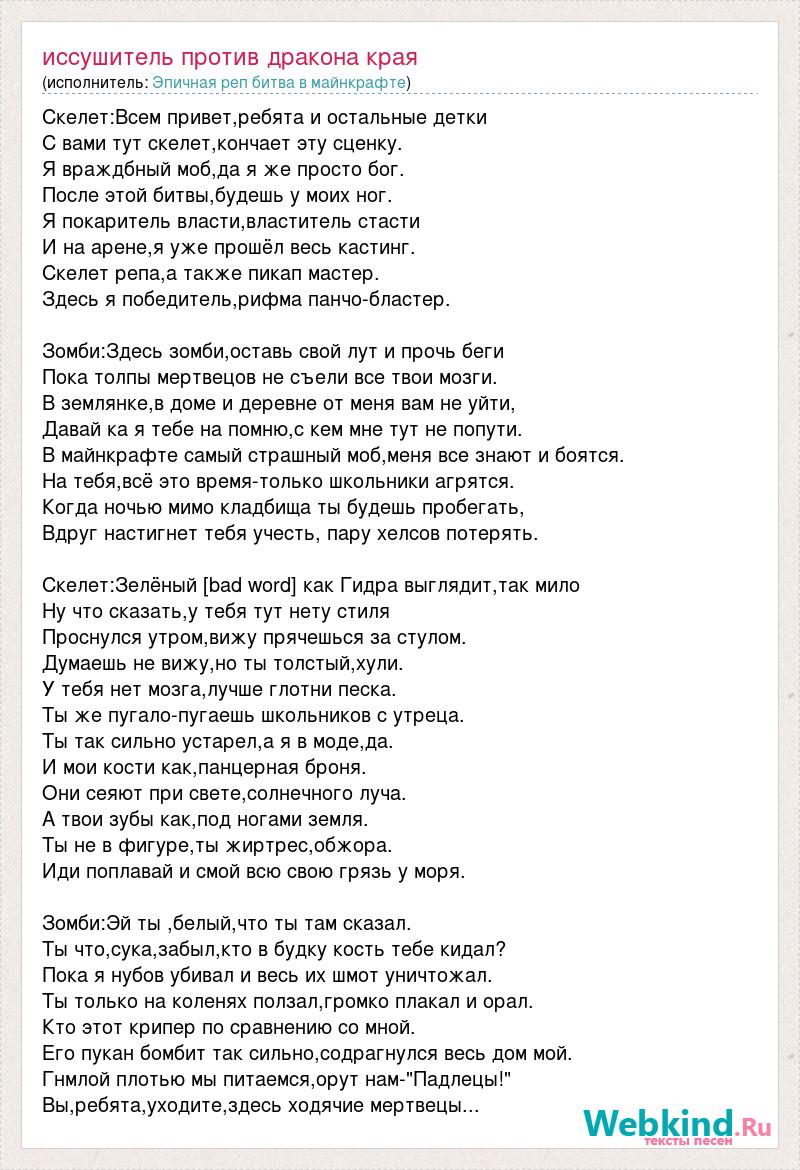 Скелет:Всем привет,ребята и остальные детки С вами тут скелет,кончает эту сценку. Я враждбный моб,да я же просто бог. После этой битвы,будешь у моих ног. Я покаритель власти,властитель стасти И на арене,я уже прошёл весь кастинг. Скелет репа,а также пикап мастер. Здесь я победитель,рифма панчо-бластер. Зомби:Здесь зомби,оставь свой лут и прочь беги Пока толпы мертвецов не съели все твои мозги. В землянке,в доме и деревне от меня вам не уйти, Давай ка я тебе на помню,с кем мне тут не попути. В майнкрафте самый страшный моб,меня все знают и боятся. На тебя,всё это время-только школьники агрятся. Когда ночью мимо кладбища ты будешь пробегать, Вдруг настигнет тебя учесть, пару хелсов потерять. Скелет:Зелёный [bad word] как Гидра выглядит,так мило Ну что сказать,у тебя тут нету стиля Проснулся утром,вижу прячешься за стулом. Думаешь не вижу,но ты толстый,хули. У тебя нет мозга,лучше глотни песка. Ты же пугало-пугаешь школьников с утреца. Ты так сильно устарел,а я в моде,да. И мои кости как,панцерная броня. Они сеяют при свете,солнечного луча. А твои зубы как,под ногами земля. Ты не в фигуре,ты жиртрес,обжора. Иди поплавай и смой всю свою грязь у моря. Зомби:Эй ты ,белый,что ты там сказал. Ты что,сука,забыл,кто в будку кость тебе кидал? Пока я нубов убивал и весь их шмот уничтожал. Ты только на коленях ползал,громко плакал и орал. Кто этот крипер по сравнению со мной. Его пукан бомбит так сильно,содрагнулся весь дом мой. Гнмлой плотью мы питаемся,орут нам-"Падлецы!" Вы,ребята,уходите,здесь ходячие мертвецы...