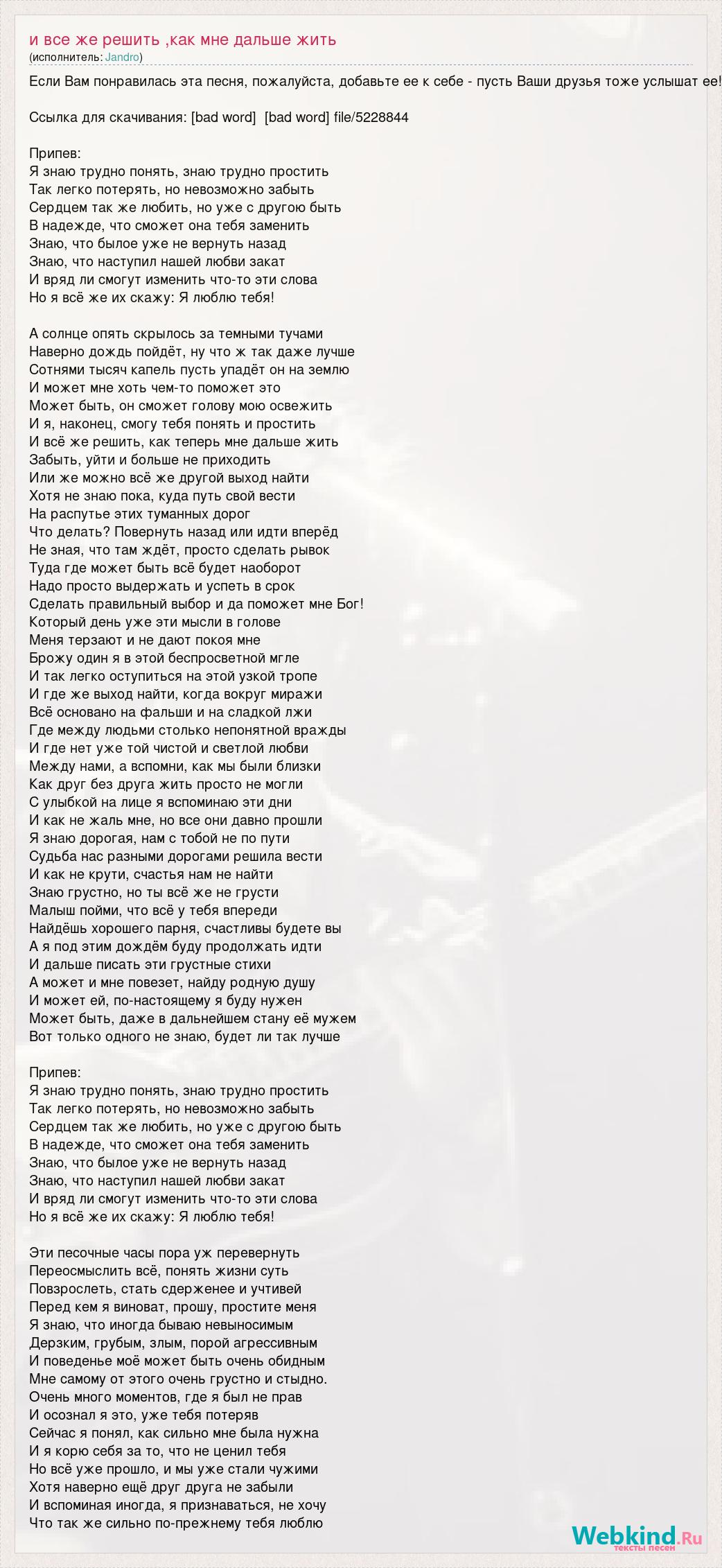Если Вам понравилась эта песня, пожалуйста, добавьте ее к себе - пусть Ваши друзья тоже услышат ее! Ссылка для скачивания: [bad word] [bad word] file/5228844 Припев: Я знаю трудно понять, знаю трудно простить Так легко потерять, но невозможно забыть Сердцем так же любить, но уже с другою быть В надежде, что сможет она тебя заменить Знаю, что былое уже не вернуть назад Знаю, что наступил нашей любви закат И вряд ли смогут изменить что-то эти слова Но я всё же их скажу: Я люблю тебя! А солнце опять скрылось за темными тучами Наверно дождь пойдёт, ну что ж так даже лучше Сотнями тысяч капель пусть упадёт он на землю И может мне хоть чем-то поможет это Может быть, он сможет голову мою освежить И я, наконец, смогу тебя понять и простить И всё же решить, как теперь мне дальше жить Забыть, уйти и больше не приходить Или же можно всё же другой выход найти Хотя не знаю пока, куда путь свой вести На распутье этих туманных дорог Что делать? Повернуть назад или идти вперёд Не зная, что там ждёт, просто сделать рывок Туда где может быть всё будет наоборот Надо просто выдержать и успеть в срок Сделать правильный выбор и да поможет мне Бог! Который день уже эти мысли в голове Меня терзают и не дают покоя мне Брожу один я в этой беспросветной мгле И так легко оступиться на этой узкой тропе И где же выход найти, когда вокруг миражи Всё основано на фальши и на сладкой лжи Где между людьми столько непонятной вражды И где нет уже той чистой и светлой любви Между нами, а вспомни, как мы были близки Как друг без друга жить просто не могли С улыбкой на лице я вспоминаю эти дни И как не жаль мне, но все они давно прошли Я знаю дорогая, нам с тобой не по пути Судьба нас разными дорогами решила вести И как не крути, счастья нам не найти Знаю грустно, но ты всё же не грусти Малыш пойми, что всё у тебя впереди Найдёшь хорошего парня, счастливы будете вы А я под этим дождём буду продолжать идти И дальше писать эти грустные стихи А может и мне повезет, найду родную душу И может ей, по-настоящему я буду нужен Может быть, даже в дальнейшем стану её мужем Вот только одного не знаю, будет ли так лучше Припев: Я знаю трудно понять, знаю трудно простить Так легко потерять, но невозможно забыть Сердцем так же любить, но уже с другою быть В надежде, что сможет она тебя заменить Знаю, что былое уже не вернуть назад Знаю, что наступил нашей любви закат И вряд ли смогут изменить что-то эти слова Но я всё же их скажу: Я люблю тебя! Эти песочные часы пора уж перевернуть Переосмыслить всё, понять жизни суть Повзрослеть, стать сдерженее и учтивей Перед кем я виноват, прошу, простите меня Я знаю, что иногда бываю невыносимым Дерзким, грубым, злым, порой агрессивным И поведенье моё может быть очень обидным Мне самому от этого очень грустно и стыдно. Очень много моментов, где я был не прав И осознал я это, уже тебя потеряв Сейчас я понял, как сильно мне была нужна И я корю себя за то, что не ценил тебя Но всё уже прошло, и мы уже стали чужими Хотя наверно ещё друг друга не забыли И вспоминая иногда, я признаваться, не хочу Что так же сильно по-прежнему тебя люблю