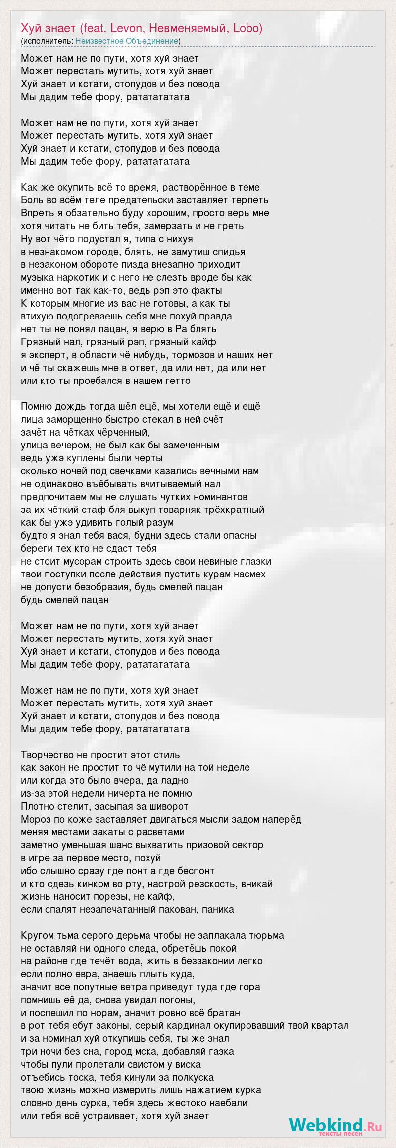 Может нам не по пути, хотя хуй знает Может перестать мутить, хотя хуй знает Хуй знает и кстати, стопудов и без повода Мы дадим тебе фору, рататататата Может нам не по пути, хотя хуй знает Может перестать мутить, хотя хуй знает Хуй знает и кстати, стопудов и без повода Мы дадим тебе фору, рататататата Как же окупить всё то время, растворённое в теме Боль во всём теле предательски заставляет терпеть Впреть я обзательно буду хорошим, просто верь мне хотя читать не бить тебя, замерзать и не греть Ну вот чёто подустал я, типа с нихуя в незнакомом городе, блять, не замутиш спидья в незаконом обороте пизда внезапно приходит музыка наркотик и с него не слезть вроде бы как именно вот так как-то, ведь рэп это факты К которым многие из вас не готовы, а как ты втихую подогреваешь себя мне похуй правда нет ты не понял пацан, я верю в Ра блять Грязный нал, грязный рэп, грязный кайф я эксперт, в области чё нибудь, тормозов и наших нет и чё ты скажешь мне в ответ, да или нет, да или нет или кто ты проебался в нашем гетто Помню дождь тогда шёл ещё, мы хотели ещё и ещё лица заморщенно быстро стекал в ней счёт зачёт на чётках чёрченный, улица вечером, не был как бы замеченным ведь ужэ куплены были черты сколько ночей под свечками казались вечными нам не одинаково въёбывать вчитываемый нал предпочитаем мы не слушать чутких номинантов за их чёткий стаф бля выкуп товарняк трёхкратный как бы ужэ удивить голый разум будто я знал тебя вася, будни здесь стали опасны береги тех кто не сдаст тебя не стоит мусорам строить здесь свои невиные глазки твои поступки после действия пустить курам насмех не допусти безобразия, будь смелей пацан будь смелей пацан Может нам не по пути, хотя хуй знает Может перестать мутить, хотя хуй знает Хуй знает и кстати, стопудов и без повода Мы дадим тебе фору, рататататата Может нам не по пути, хотя хуй знает Может перестать мутить, хотя хуй знает Хуй знает и кстати, стопудов и без повода Мы дадим тебе фору, рататататата Творчество не простит этот стиль как закон не простит то чё мутили на той неделе или когда это было вчера, да ладно из-за этой недели ничерта не помню Плотно стелит, засыпая за шиворот Мороз по коже заставляет двигаться мысли задом наперёд меняя местами закаты с расветами заметно уменьшая шанс выхватить призовой сектор в игре за первое место, похуй ибо слышно сразу где понт а где беспонт и кто сдезь кинком во рту, настрой резскость, вникай жизнь наносит порезы, не кайф, если спалят незапечатанный пакован, паника Кругом тьма серого дерьма чтобы не заплакала тюрьма не оставляй ни одного следа, обретёшь покой на районе где течёт вода, жить в беззаконии легко если полно евра, знаешь плыть куда, значит все попутные ветра приведут туда где гора помнишь её да, снова увидал погоны, и поспешил по норам, значит ровно всё братан в рот тебя ебут законы, серый кардинал окупировавший твой квартал и за номинал хуй откупишь себя, ты же знал три ночи без сна, город мска, добавляй газка чтобы пули пролетали свистом у виска отъебись тоска, тебя кинули за полкуска твою жизнь можно измерить лишь нажатием курка словно день сурка, тебя здесь жестоко наебали или тебя всё устраивает, хотя хуй знает