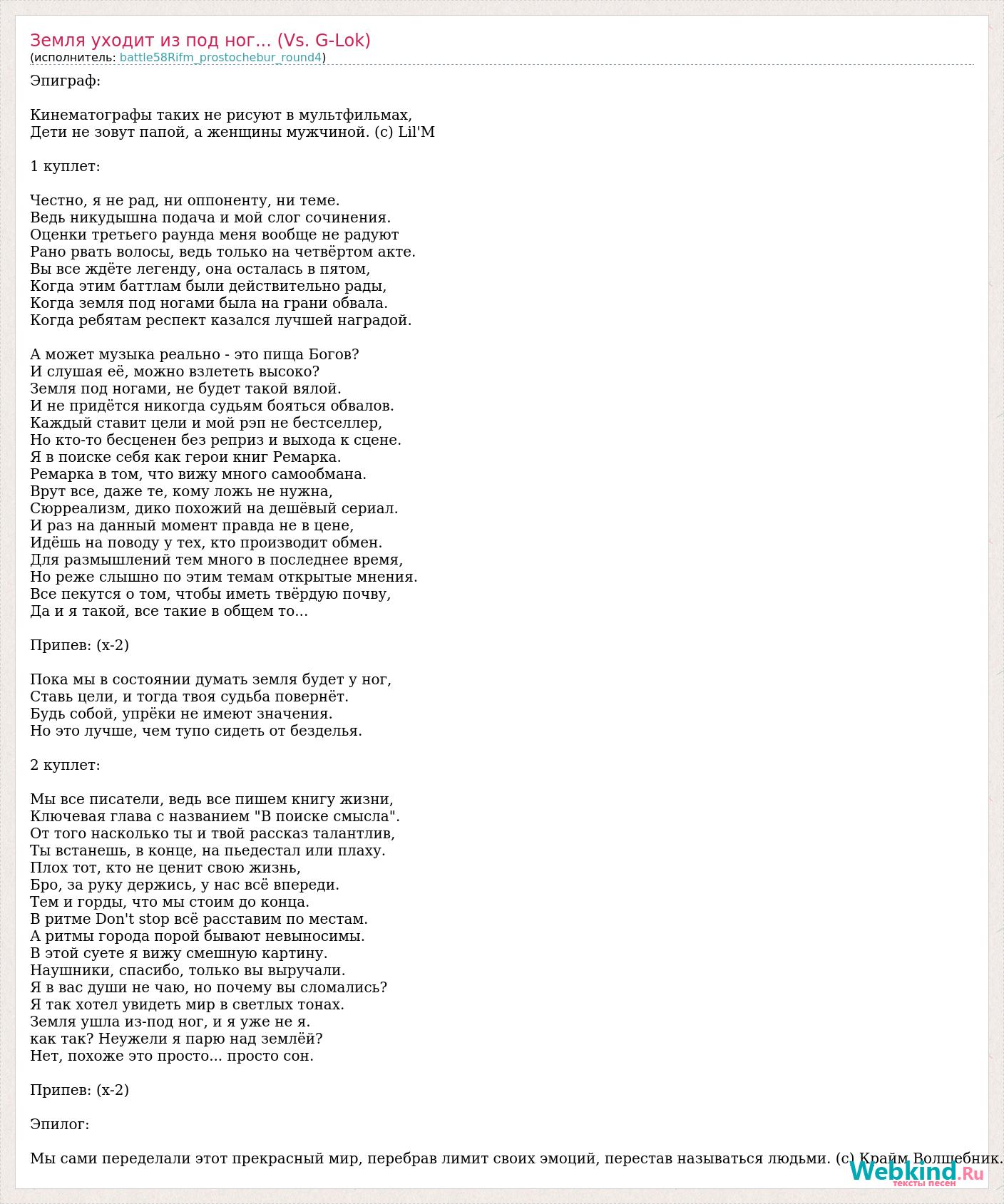 Эпиграф: Кинематографы таких не рисуют в мультфильмах, Дети не зовут папой, а женщины мужчиной. (с) Lil'M 1 куплет: Честно, я не рад, ни оппоненту, ни теме. Ведь никудышна подача и мой слог сочинения. Оценки третьего раунда меня вообще не радуют Рано рвать волосы, ведь только на четвёртом акте. Вы все ждёте легенду, она осталась в пятом, Когда этим баттлам были действительно рады, Когда земля под ногами была на грани обвала. Когда ребятам респект казался лучшей наградой. А может музыка реально - это пища Богов? И слушая её, можно взлететь высоко? Земля под ногами, не будет такой вялой. И не придётся никогда судьям бояться обвалов. Каждый ставит цели и мой рэп не бестселлер, Но кто-то бесценен без реприз и выхода к сцене. Я в поиске себя как герои книг Ремарка. Ремарка в том, что вижу много самообмана. Врут все, даже те, кому ложь не нужна, Сюрреализм, дико похожий на дешёвый сериал. И раз на данный момент правда не в цене, Идёшь на поводу у тех, кто производит обмен. Для размышлений тем много в последнее время, Но реже слышно по этим темам открытые мнения. Все пекутся о том, чтобы иметь твёрдую почву, Да и я такой, все такие в общем то... Припев: (x-2) Пока мы в состоянии думать земля будет у ног, Ставь цели, и тогда твоя судьба повернёт. Будь собой, упрёки не имеют значения. Но это лучше, чем тупо сидеть от безделья. 2 куплет: Мы все писатели, ведь все пишем книгу жизни, Ключевая глава с названием "В поиске смысла". От того насколько ты и твой рассказ талантлив, Ты встанешь, в конце, на пьедестал или плаху. Плох тот, кто не ценит свою жизнь, Бро, за руку держись, у нас всё впереди. Тем и горды, что мы стоим до конца. В ритме Don't stop всё расставим по местам. А ритмы города порой бывают невыносимы. В этой суете я вижу смешную картину. Наушники, спасибо, только вы выручали. Я в вас души не чаю, но почему вы сломались? Я так хотел увидеть мир в светлых тонах. Земля ушла из-под ног, и я уже не я. как так? Неужели я парю над землёй? Нет, похоже это просто... просто сон. Припев: (x-2) Эпилог: Мы сами переделали этот прекрасный мир, перебрав лимит своих эмоций, перестав называться людьми. (с) Крайм Волшебник.