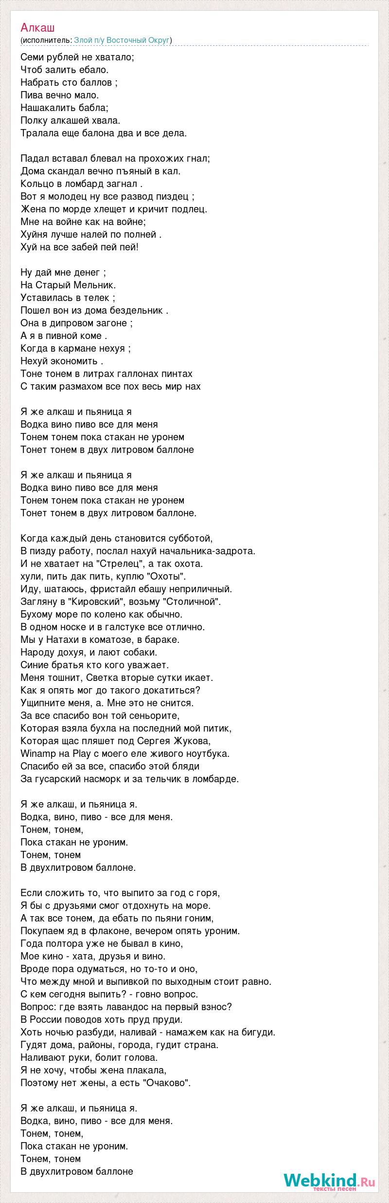 Семи рублей не хватало; Чтоб залить ебало. Набрать сто баллов ; Пива вечно мало. Нашакалить бабла; Полку алкашей хвала. Тралала еще балона два и все дела. Падал вставал блевал на прохожих гнал; Дома скандал вечно пъяный в кал. Кольцо в ломбард загнал . Вот я молодец ну все развод пиздец ; Жена по морде хлещет и кричит подлец. Мне на войне как на войне; Хуйня лучше налей по полней . Хуй на все забей пей пей! Ну дай мне денег ; На Старый Мельник. Уставилась в телек ; Пошел вон из дома бездельник . Она в дипровом загоне ; А я в пивной коме . Когда в кармане нехуя ; Нехуй экономить . Тоне тонем в литрах галлонах пинтах С таким размахом все пох весь мир нах Я же алкаш и пьяница я Водка вино пиво все для меня Тонем тонем пока стакан не уронем Тонет тонем в двух литровом баллоне Я же алкаш и пьяница я Водка вино пиво все для меня Тонем тонем пока стакан не уронем Тонет тонем в двух литровом баллоне. Когда каждый день становится субботой, В пизду работу, послал нахуй начальника-задрота. И не хватает на "Стрелец", а так охота. хули, пить дак пить, куплю "Охоты". Иду, шатаюсь, фристайл ебашу неприличный. Загляну в "Кировский", возьму "Столичной". Бухому море по колено как обычно. В одном носке и в галстуке все отлично. Мы у Натахи в коматозе, в бараке. Народу дохуя, и лают собаки. Синие братья кто кого уважает. Меня тошнит, Светка вторые сутки икает. Как я опять мог до такого докатиться? Ущипните меня, а. Мне это не снится. За все спасибо вон той сеньорите, Которая взяла бухла на последний мой питик, Которая щас пляшет под Сергея Жукова, Winamp на Play с моего еле живого ноутбука. Спасибо ей за все, спасибо этой бляди За гусарский насморк и за тельчик в ломбарде. Я же алкаш, и пьяница я. Водка, вино, пиво - все для меня. Тонем, тонем, Пока стакан не уроним. Тонем, тонем В двухлитровом баллоне. Если сложить то, что выпито за год с горя, Я бы с друзьями смог отдохнуть на море. А так все тонем, да ебать по пьяни гоним, Покупаем яд в флаконе, вечером опять уроним. Года полтора уже не бывал в кино, Мое кино - хата, друзья и вино. Вроде пора одуматься, но то-то и оно, Что между мной и выпивкой по выходным стоит равно. С кем сегодня выпить? - говно вопрос. Вопрос: где взять лавандос на первый взнос? В России поводов хоть пруд пруди. Хоть ночью разбуди, наливай - намажем как на бигуди. Гудят дома, районы, города, гудит страна. Наливают руки, болит голова. Я не хочу, чтобы жена плакала, Поэтому нет жены, а есть "Очаково". Я же алкаш, и пьяница я. Водка, вино, пиво - все для меня. Тонем, тонем, Пока стакан не уроним. Тонем, тонем В двухлитровом баллоне