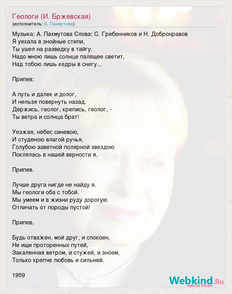 Музыка: А. Пахмутова Слова: С. Гребенников и Н. Добронравов Я уехала в знойные степи, Ты ушел на разведку в тайгу. Надо мною лишь солнце палящее светит, Над тобою лишь кедры в снегу… Припев: А путь и далек и долог, И нельзя повернуть назад. Держись, геолог, крепись, геолог, - Ты ветра и солнца брат! Уезжая, небес синевою, И студеною влагой ручья, Голубою заветной полярной звездою Поклялась в нашей верности я. Припев. Лучше друга нигде не найду я. Мы геологи оба с тобой. Мы умеем и в жизни руду дорогую Отличать от породы пустой! Припев. Будь отважен, мой друг, и спокоен, Не ищи проторенных путей, Закаленная ветром, и стужей, и зноем, Только крепче любовь и сильней. 1959