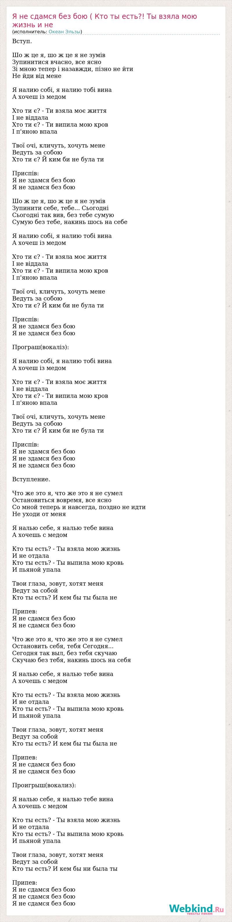 Вступ. Шо ж це я, шо ж це я не зумів Зупинитися вчасно, все ясно Зі мною тепер і назавжди, пізно не йти Не йди від мене Я налию собі, я налию тобі вина А хочеш із медом Хто ти є? - Ти взяла моє життя І не віддала Хто ти є? - Ти випила мою кров І п'яною впала Твої очі, кличуть, хочуть мене Ведуть за собою Хто ти є? Й ким би не була ти Приспів: Я не здамся без бою Я не здамся без бою Шо ж це я, шо ж це я не зумів Зупинити себе, тебе... Сьогодні Сьогодні так вив, без тебе сумую Сумую без тебе, накинь шось на себе Я налию собі, я налию тобі вина А хочеш із медом Хто ти є? - Ти взяла моє життя І не віддала Хто ти є? - Ти випила мою кров І п'яною впала Твої очі, кличуть, хочуть мене Ведуть за собою Хто ти є? Й ким би не була ти Приспів: Я не здамся без бою Я не здамся без бою Програш(вокаліз): Я налию собі, я налию тобі вина А хочеш із медом Хто ти є? - Ти взяла моє життя І не віддала Хто ти є? - Ти випила мою кров І п'яною впала Твої очі, кличуть, хочуть мене Ведуть за собою Хто ти є? Й ким би не була ти Приспів: Я не здамся без бою Я не здамся без бою Я не здамся без бою Вступление. Что же это я, что же это я не сумел Остановиться вовремя, все ясно Со мной теперь и навсегда, поздно не идти Не уходи от меня Я налью себе, я налью тебе вина А хочешь с медом Кто ты есть? - Ты взяла мою жизнь И не отдала Кто ты есть? - Ты выпила мою кровь И пьяной упала Твои глаза, зовут, хотят меня Ведут за собой Кто ты есть? И кем бы ты была не Припев: Я не сдамся без бою Я не сдамся без бою Что же это я, что же это я не сумел Остановить себя, тебя Сегодня... Сегодня так выл, без тебя скучаю Скучаю без тебя, накинь шось на себя Я налью себе, я налью тебе вина А хочешь с медом Кто ты есть? - Ты взяла мою жизнь И не отдала Кто ты есть? - Ты выпила мою кровь И пьяной упала Твои глаза, зовут, хотят меня Ведут за собой Кто ты есть? И кем бы ты была не Припев: Я не сдамся без бою Я не сдамся без бою Проигрыш(вокализ): Я налью себе, я налью тебе вина А хочешь с медом Кто ты есть? - Ты взяла мою жизнь И не отдала Кто ты есть? - Ты выпила мою кровь И пьяной упала Твои глаза, зовут, хотят меня Ведут за собой Кто ты есть? И кем бы ни была ты Припев: Я не сдамся без бою Я не сдамся без бою Я не сдамся без бою