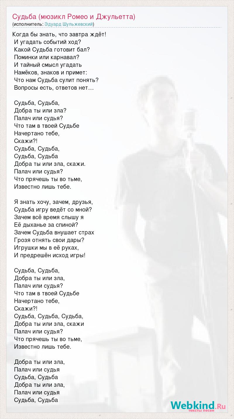 Когда бы знать, что завтра ждёт! И угадать событий ход? Какой Судьба готовит бал? Поминки или карнавал? И тайный смысл угадать Намёков, знаков и примет: Что нам Судьба сулит понять? Вопросы есть, ответов нет… Судьба, Судьба, Добра ты или зла? Палач или судья? Что там в твоей Судьбе Начертано тебе, Скажи?! Судьба, Судьба, Судьба, Судьба Добра ты или зла, скажи. Палач или судья? Что прячешь ты во тьме, Известно лишь тебе. Я знать хочу, зачем, друзья, Судьба игру ведёт со мной? Зачем всё время слышу я Её дыханье за спиной? Зачем Судьба внушает страх Грозя отнять свои дары? Игрушки мы в её руках, И предрешён исход игры! Судьба, Судьба, Добра ты или зла, Палач или судья? Что там в твоей Судьбе Начертано тебе, Скажи?! Судьба, Судьба, Судьба, Добра ты или зла, скажи Палач или судья? Что прячешь ты во тьме, Известно лишь тебе. Добра ты или зла, Палач или судья Судьба, Судьба Добра ты или зла, Палач или судья Судьба, Судьба