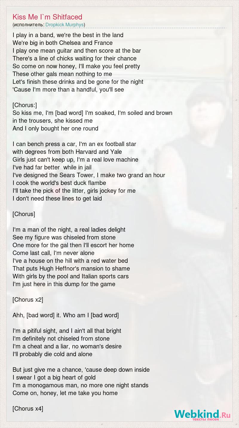 I play in a band, we're the best in the land We're big in both Chelsea and France I play one mean guitar and then score at the bar There's a line of chicks waiting for their chance So come on now honey, I'll make you feel pretty These other gals mean nothing to me Let's finish these drinks and be gone for the night 'Cause I'm more than a handful, you'll see [Chorus:] So kiss me, I'm [bad word] I'm soaked, I'm soiled and brown in the trousers, she kissed me And I only bought her one round I can bench press a car, I'm an ex football star with degrees from both Harvard and Yale Girls just can't keep up, I'm a real love machine I've had far better while in jail I've designed the Sears Tower, I make two grand an hour I cook the world's best duck flambe I'll take the pick of the litter, girls jockey for me I don't need these lines to get laid [Chorus] I'm a man of the night, a real ladies delight See my figure was chiseled from stone One more for the gal then I'll escort her home Come last call, I'm never alone I've a house on the hill with a red water bed That puts Hugh Heffnor's mansion to shame With girls by the pool and Italian sports cars I'm just here in this dump for the game [Chorus x2] Ahh, [bad word] it. Who am I [bad word] I'm a pitiful sight, and I ain't all that bright I'm definitely not chiseled from stone I'm a cheat and a liar, no woman's desire I'll probably die cold and alone But just give me a chance, 'cause deep down inside I swear I got a big heart of gold I'm a monogamous man, no more one night stands Come on, honey, let me take you home [Chorus x4]