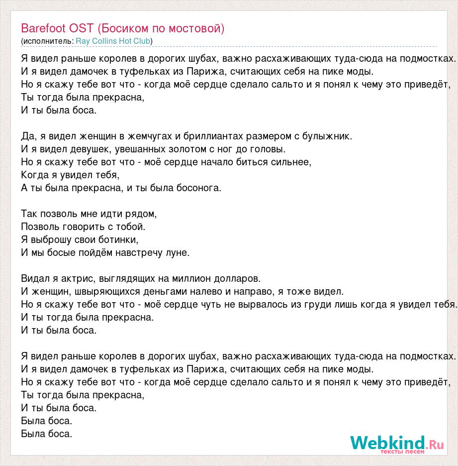 Я видел раньше королев в дорогих шубах, важно расхаживающих туда-сюда на подмостках. И я видел дамочек в туфельках из Парижа, считающих себя на пике моды. Но я скажу тебе вот что - когда моё сердце сделало сальто и я понял к чему это приведёт, Ты тогда была прекрасна, И ты была боса. Да, я видел женщин в жемчугах и бриллиантах размером с булыжник. И я видел девушек, увешанных золотом с ног до головы. Но я скажу тебе вот что - моё сердце начало биться сильнее, Когда я увидел тебя, А ты была прекрасна, и ты была босонога. Так позволь мне идти рядом, Позволь говорить с тобой. Я выброшу свои ботинки, И мы босые пойдём навстречу луне. Видал я актрис, выглядящих на миллион долларов. И женщин, швыряющихся деньгами налево и направо, я тоже видел. Но я скажу тебе вот что - моё сердце чуть не вырвалось из груди лишь когда я увидел тебя. И ты тогда была прекрасна. И ты была боса. Я видел раньше королев в дорогих шубах, важно расхаживающих туда-сюда на подмостках. И я видел дамочек в туфельках из Парижа, считающих себя на пике моды. Но я скажу тебе вот что - когда моё сердце сделало сальто и я понял к чему это приведёт, Ты тогда была прекрасна, И ты была боса. Была боса. Была боса.