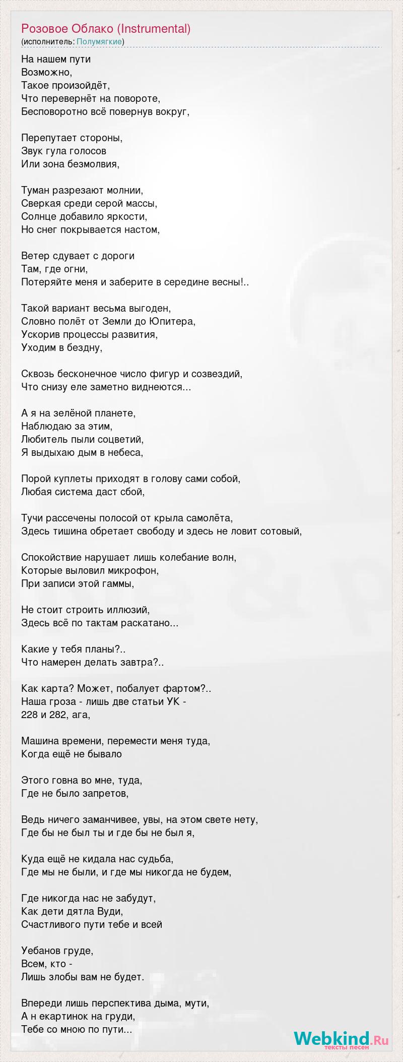 На нашем пути Возможно, Такое произойдёт, Что перевернёт на повороте, Бесповоротно всё повернув вокруг, Перепутает стороны, Звук гула голосов Или зона безмолвия, Туман разрезают молнии, Сверкая среди серой массы, Солнце добавило яркости, Но снег покрывается настом, Ветер сдувает с дороги Там, где огни, Потеряйте меня и заберите в середине весны!.. Такой вариант весьма выгоден, Словно полёт от Земли до Юпитера, Ускорив процессы развития, Уходим в бездну, Сквозь бесконечное число фигур и созвездий, Что снизу еле заметно виднеются... А я на зелёной планете, Наблюдаю за этим, Любитель пыли соцветий, Я выдыхаю дым в небеса, Порой куплеты приходят в голову сами собой, Любая система даст сбой, Тучи рассечены полосой от крыла самолёта, Здесь тишина обретает свободу и здесь не ловит сотовый, Спокойствие нарушает лишь колебание волн, Которые выловил микрофон, При записи этой гаммы, Не стоит строить иллюзий, Здесь всё по тактам раскатано... Какие у тебя планы?.. Что намерен делать завтра?.. Как карта? Может, побалует фартом?.. Наша гроза - лишь две статьи УК - 228 и 282, ага, Машина времени, перемести меня туда, Когда ещё не бывало Этого говна во мне, туда, Где не было запретов, Ведь ничего заманчивее, увы, на этом свете нету, Где бы не был ты и где бы не был я, Куда ещё не кидала нас судьба, Где мы не были, и где мы никогда не будем, Где никогда нас не забудут, Как дети дятла Вуди, Счастливого пути тебе и всей Уебанов груде, Всем, кто - Лишь злобы вам не будет. Впереди лишь перспектива дыма, мути, А н екартинок на груди, Тебе со мною по пути...