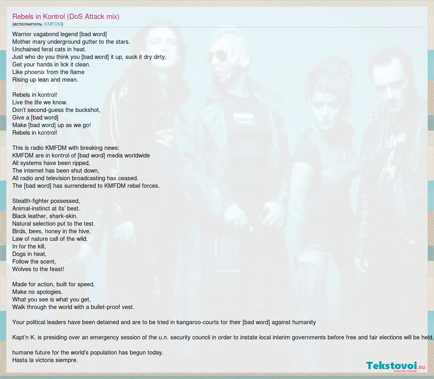 Warrior vagabond legend [bad word] Mother mary underground gutter to the stars. Unchained feral cats in heat. Just who do you think you are? Rub it up, suck it dry dirty, Get your hands in lick it clean. Like phoenix from the flame Rising up lean and mean. Rebels in kontrol! Live the life we know. Don’t second-guess the buckshot, Give a [bad word] Make the rules up as we go! Rebels in kontrol! This is radio KMFDM with breaking news: KMFDM are in kontrol of all communications media worldwide All systems have been ripped, The internet has been shut down, All radio and television broadcasting has ceased. The military-industrial complex has surrendered to KMFDM rebel forces. Stealth-fighter possessed, Animal-instinct at its’ best. Black leather, shark-skin. Natural selection put to the test. Birds, bees, honey in the hive, Law of nature call of the wild. In for the kill, Dogs in heat, Follow the scent, Wolves to the feast! Made for action, built for speed, Make no apologies. What you see is what you get, Walk through the world with a bullet-proof vest. Your political leaders have been detained and are to be tried in kangaroo-courts for their crimes committed against humanity Kapt’n K. is presiding over an emergency session of the u.n. security council in order to instate local interim governments before free and fair elections will be held. humane future for the world’s population has begun today. Hasta la victoria siempre.