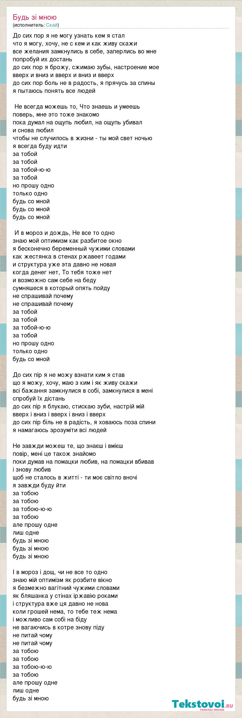 До сих пор я не могу узнать кем я стал что я могу, хочу, не с кем и как живу скажи все желания замкнулись в себе, заперлись во мне попробуй их достань до сих пор я брожу, сжимаю зубы, настроение мое вверх и вниз и вверх и вниз и вверх до сих пор боль не в радость, я прячусь за спины я пытаюсь понять все людей Не всегда можешь то, Что знаешь и умеешь поверь, мне это тоже знакомо пока думал на ощупь любил, на ощупь убивал и снова любил чтобы не случилось в жизни - ты мой свет ночью я всегда буду идти за тобой за тобой за тобой-ю-ю за тобой но прошу одно только одно будь со мной будь со мной будь со мной И в мороз и дождь, Не все то одно знаю мой оптимизм как разбитое окно я бесконечно беременный чужими словами как жестянка в стенах ржавеет годами и структура уже эта давно не новая когда денег нет, То тебя тоже нет и возможно сам себе на беду сумняшеся в который опять пойду не спрашивай почему не спрашивай почему за тобой за тобой за тобой-ю-ю за тобой но прошу одно только одно будь со мной До сих пір я не можу взнати ким я став що я можу, хочу, маю з ким і як живу скажи всі бажання замкнулися в собі, замкнулися в мені спробуй їх дістань до сих пір я блукаю, стискаю зуби, настрій мій вверх і вниз і вверх і вниз і вверх до сих пір біль не в радість, я ховаюсь поза спини я намагаюсь зрозуміти всі людей Не завжди можеш те, що знаєш і вмієш повір, мені це також знайомо поки думав на помацки любив, на помацки вбивав і знову любив щоб не сталось в житті - ти моє світло вночі я завжди буду йти за тобою за тобою за тобою-ю-ю за тобою але прошу одне лиш одне будь зі мною будь зі мною будь зі мною І в мороз і дощ, чи не все то одно знаю мій оптимізм як розбите вікно я безмежно вагітний чужими словами як бляшанка у стінах іржавію роками і структура вже ця давно не нова коли грошей нема, то тебе теж нема і можливо сам собі на біду не вагаючись в котре знову піду не питай чому не питай чому за тобою за тобою за тобою-ю-ю за тобою але прошу одне лиш одне будь зі мною