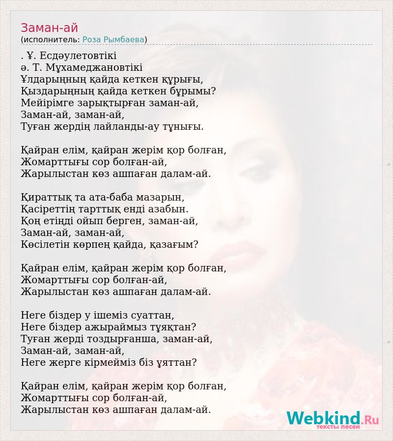 . Ұ. Есдәулетовтiкi ә. Т. Мұхамеджановтiкi Ұлдарыңның қайда кеткен құрығы, Қыздарыңның қайда кеткен бұрымы? Мейiрiмге зарықтырған заман-ай, Заман-ай, заман-ай, Туған жердiң лайланды-ау тұнығы. Қайран елiм, қайран жерiм қор болған, Жомарттығы сор болған-ай, Жарылыстан көз ашпаған далам-ай. Қираттық та ата-баба мазарын, Қасiреттiң тарттық ендi азабын. Қоң етiңдi ойып берген, заман-ай, Заман-ай, заман-ай, Көсiлетiн көрпең қайда, қазағым? Қайран елiм, қайран жерiм қор болған, Жомарттығы сор болған-ай, Жарылыстан көз ашпаған далам-ай. Неге бiздер у iшемiз суаттан, Неге бiздер ажыраймыз тұяқтан? Туған жердi тоздырғанша, заман-ай, Заман-ай, заман-ай, Неге жерге кiрмеймiз бiз ұяттан? Қайран елiм, қайран жерiм қор болған, Жомарттығы сор болған-ай, Жарылыстан көз ашпаған далам-ай.