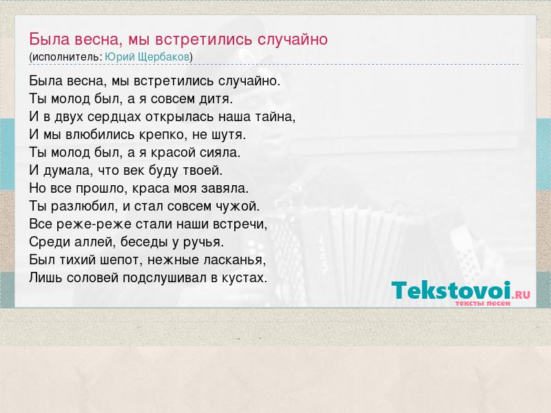 Была весна, мы встретились случайно. Ты молод был, а я совсем дитя. И в двух сердцах открылась наша тайна, И мы влюбились крепко, не шутя. Ты молод был, а я красой сияла. И думала, что век буду твоей. Но все прошло, краса моя завяла. Ты разлюбил, и стал совсем чужой. Все реже-реже стали наши встречи, Среди аллей, беседы у ручья. Был тихий шепот, нежные ласканья, Лишь соловей подслушивал в кустах.