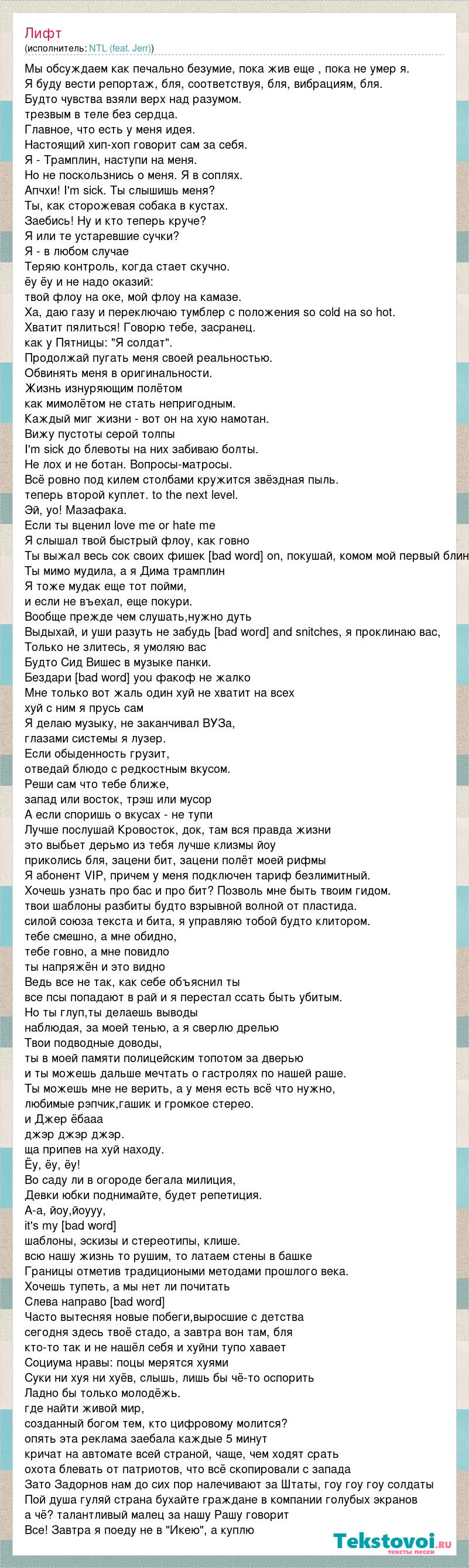 Мы обсуждаем как печально безумие, пока жив еще , пока не умер я. Я буду вести репортаж, бля, соответствуя, бля, вибрациям, бля. Будто чувства взяли верх над разумом. трезвым в теле без сердца. Главное, что есть у меня идея. Настоящий хип-хоп говорит сам за себя. Я - Трамплин, наступи на меня. Но не поскользнись о меня. Я в соплях. Апчхи! I'm sick. Ты слышишь меня? Ты, как сторожевая собака в кустах. Заебись! Ну и кто теперь круче? Я или те устаревшие сучки? Я - в любом случае Теряю контроль, когда стает скучно. ёу ёу и не надо оказий: твой флоу на оке, мой флоу на камазе. Ха, даю газу и переключаю тумблер с положения so cold на so hot. Хватит пялиться! Говорю тебе, засранец. как у Пятницы: "Я солдат". Продолжай пугать меня своей реальностью. Обвинять меня в оригинальности. Жизнь изнуряющим полётом как мимолётом не стать непригодным. Каждый миг жизни - вот он на хую намотан. Вижу пустоты серой толпы I'm sick до блевоты на них забиваю болты. Не лох и не ботан. Вопросы-матросы. Всё ровно под килем столбами кружится звёздная пыль. теперь второй куплет. to the next level. Эй, yo! Мазафака. Если ты вценил love me or hate me Я слышал твой быстрый флоу, как говно Ты выжал весь сок своих фишек давно come on, покушай, комом мой первый блин Ты мимо мудила, а я Дима трамплин Я тоже мудак еще тот пойми, и если не въехал, еще покури. Вообще прежде чем слушать,нужно дуть Выдыхай, и уши разуть не забудь [bad word] and snitches, я проклинаю вас, Только не злитесь, я умоляю вас Будто Сид Вишес в музыке панки. Бездари [bad word] you факоф не жалко Мне только вот жаль один хуй не хватит на всех хуй с ним я прусь сам Я делаю музыку, не заканчивал ВУЗа, глазами системы я лузер. Если обыденность грузит, отведай блюдо с редкостным вкусом. Реши сам что тебе ближе, запад или восток, трэш или мусор А если споришь о вкусах - не тупи Лучше послушай Кровосток, док, там вся правда жизни это выбьет дерьмо из тебя лучше клизмы йоу приколись бля, зацени бит, зацени полёт моей рифмы Я абонент VIP, причем у меня подключен тариф безлимитный. Хочешь узнать про бас и про бит? Позволь мне быть твоим гидом. твои шаблоны разбиты будто взрывной волной от пластида. силой союза текста и бита, я управляю тобой будто клитором. тебе смешно, а мне обидно, тебе говно, а мне повидло ты напряжён и это видно Ведь все не так, как себе объяснил ты все псы попадают в рай и я перестал ссать быть убитым. Но ты глуп,ты делаешь выводы наблюдая, за моей тенью, а я сверлю дрелью Твои подводные доводы, ты в моей памяти полицейским топотом за дверью и ты можешь дальше мечтать о гастролях по нашей раше. Ты можешь мне не верить, а у меня есть всё что нужно, любимые рэпчик,гашик и громкое стерео. и Джер ёбааа джэр джэр джэр. ща припев на хуй находу. Ёу, ёу, ёу! Во саду ли в огороде бегала милиция, Девки юбки поднимайте, будет репетиция. А-а, йоу,йоууу, it's my [bad word] шаблоны, эскизы и стереотипы, клише. всю нашу жизнь то рушим, то латаем стены в башке Границы отметив традициоными методами прошлого века. Хочешь тупеть, а мы нет ли почитать Слева направо [bad word] Часто вытесняя новые побеги,выросшие с детства сегодня здесь твоё стадо, а завтра вон там, бля кто-то так и не нашёл себя и хуйни тупо хавает Социума нравы: поцы мерятся хуями Суки ни хуя ни хуёв, слышь, лишь бы чё-то оспорить Ладно бы только молодёжь. где найти живой мир, созданный богом тем, кто цифровому молится? опять эта реклама заебала каждые 5 минут кричат на ав