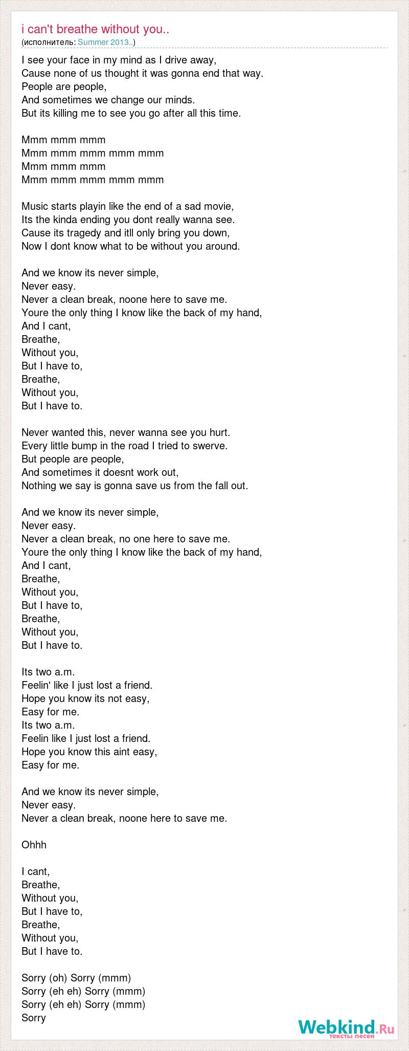 I see your face in my mind as I drive away, Cause none of us thought it was gonna end that way. People are people, And sometimes we change our minds. But its killing me to see you go after all this time. Mmm mmm mmm Mmm mmm mmm mmm mmm Mmm mmm mmm Mmm mmm mmm mmm mmm Music starts playin like the end of a sad movie, Its the kinda ending you dont really wanna see. Cause its tragedy and itll only bring you down, Now I dont know what to be without you around. And we know its never simple, Never easy. Never a clean break, noone here to save me. Youre the only thing I know like the back of my hand, And I cant, Breathe, Without you, But I have to, Breathe, Without you, But I have to. Never wanted this, never wanna see you hurt. Every little bump in the road I tried to swerve. But people are people, And sometimes it doesnt work out, Nothing we say is gonna save us from the fall out. And we know its never simple, Never easy. Never a clean break, no one here to save me. Youre the only thing I know like the back of my hand, And I cant, Breathe, Without you, But I have to, Breathe, Without you, But I have to. Its two a.m. Feelin' like I just lost a friend. Hope you know its not easy, Easy for me. Its two a.m. Feelin like I just lost a friend. Hope you know this aint easy, Easy for me. And we know its never simple, Never easy. Never a clean break, noone here to save me. Ohhh I cant, Breathe, Without you, But I have to, Breathe, Without you, But I have to. Sorry (oh) Sorry (mmm) Sorry (eh eh) Sorry (mmm) Sorry (eh eh) Sorry (mmm) Sorry