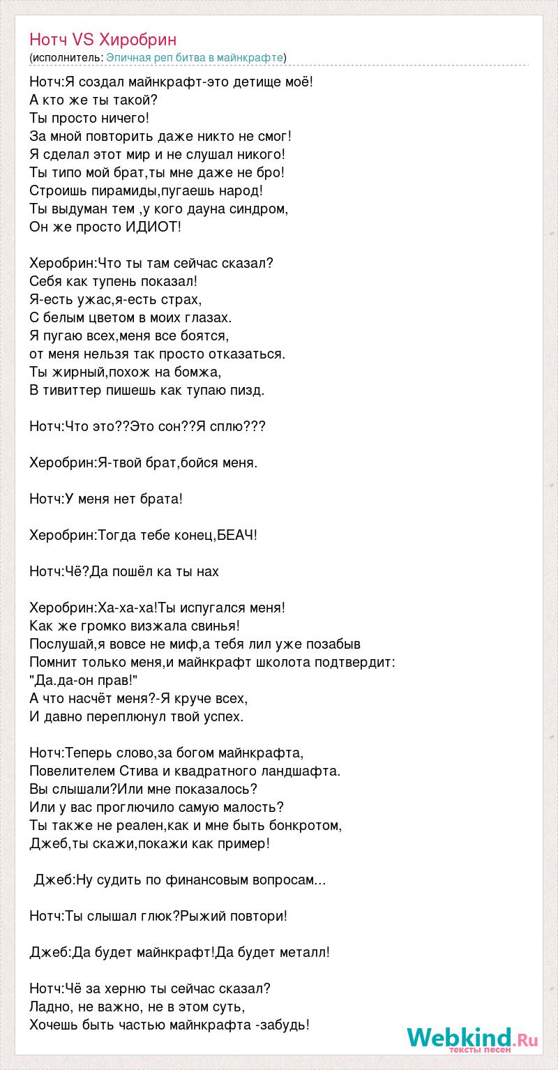 Нотч:Я создал майнкрафт-это детище моё! А кто же ты такой? Ты просто ничего! За мной повторить даже никто не смог! Я сделал этот мир и не слушал никого! Ты типо мой брат,ты мне даже не бро! Строишь пирамиды,пугаешь народ! Ты выдуман тем ,у кого дауна синдром, Он же просто ИДИОТ! Херобрин:Что ты там сейчас сказал? Себя как тупень показал! Я-есть ужас,я-есть страх, С белым цветом в моих глазах. Я пугаю всех,меня все боятся, от меня нельзя так просто отказаться. Ты жирный,похож на бомжа, В тивиттер пишешь как тупаю пизд. Нотч:Что это??Это сон??Я сплю??? Херобрин:Я-твой брат,бойся меня. Нотч:У меня нет брата! Херобрин:Тогда тебе конец,БЕАЧ! Нотч:Чё?Да пошёл ка ты нах Херобрин:Ха-ха-ха!Ты испугался меня! Как же громко визжала свинья! Послушай,я вовсе не миф,а тебя лил уже позабыв Помнит только меня,и майнкрафт школота подтвердит: "Да.да-он прав!" А что насчёт меня?-Я круче всех, И давно переплюнул твой успех. Нотч:Теперь слово,за богом майнкрафта, Повелителем Стива и квадратного ландшафта. Вы слышали?Или мне показалось? Или у вас проглючило самую малость? Ты также не реален,как и мне быть бонкротом, Джеб,ты скажи,покажи как пример! Джеб:Ну судить по финансовым вопросам... Нотч:Ты слышал глюк?Рыжий повтори! Джеб:Да будет майнкрафт!Да будет металл! Нотч:Чё за херню ты сейчас сказал? Ладно, не важно, не в этом суть, Хочешь быть частью майнкрафта -забудь!