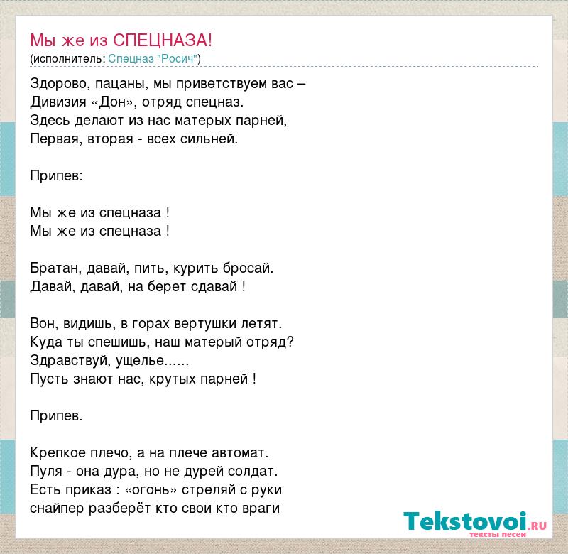 Здорово, пацаны, мы приветствуем вас – Дивизия «Дон», отряд спецназ. Здесь делают из нас матерых парней, Первая, вторая - всех сильней. Припев: Мы же из спецназа ! Мы же из спецназа ! Братан, давай, пить, курить бросай. Давай, давай, на берет сдавай ! Вон, видишь, в горах вертушки летят. Куда ты спешишь, наш матерый отряд? Здравствуй, ущелье...... Пусть знают нас, крутых парней ! Припев. Крепкое плечо, а на плече автомат. Пуля - она дура, но не дурей солдат. Есть приказ : «огонь» стреляй с руки снайпер разберёт кто свои кто враги