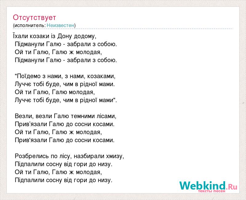 Їхали козаки із Дону додому, Підманули Галю - забрали з собою. Ой ти Галю, Галю ж молодая, Підманули Галю - забрали з собою. "Поїдемо з нами, з нами, козаками, Луччє тобі буде, чим в рідної мами. Ой ти Галю, Галю молодая, Луччє тобі буде, чим в рідної мами". Везли, везли Галю темними лісами, Прив’язали Галю до сосни косами. Ой ти Галю, Галю ж молодая, Прив'язали Галю до сосни косами. Розбрелись по лісу, назбирали хмизу, Підпалили сосну від гори до низу. Ой ти Галю, Галю ж молодая, Підпалили сосну від гори до низу.