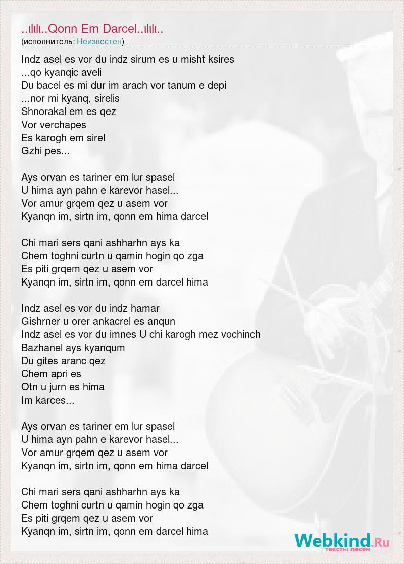 Indz asel es vor du indz sirum es u misht ksires ...qo kyanqic aveli Du bacel es mi dur im arach vor tanum e depi ...nor mi kyanq, sirelis Shnorakal em es qez Vor verchapes Es karogh em sirel Gzhi pes... Ays orvan es tariner em lur spasel U hima ayn pahn e karevor hasel... Vor amur grqem qez u asem vor Kyanqn im, sirtn im, qonn em hima darcel Chi mari sers qani ashharhn ays ka Chem toghni curtn u qamin hogin qo zga Es piti grqem qez u asem vor Kyanqn im, sirtn im, qonn em darcel hima Indz asel es vor du indz hamar Gishrner u orer ankacrel es anqun Indz asel es vor du imnes U chi karogh mez vochinch Bazhanel ays kyanqum Du gites aranc qez Chem apri es Otn u jurn es hima Im karces... Ays orvan es tariner em lur spasel U hima ayn pahn e karevor hasel... Vor amur grqem qez u asem vor Kyanqn im, sirtn im, qonn em hima darcel Chi mari sers qani ashharhn ays ka Chem toghni curtn u qamin hogin qo zga Es piti grqem qez u asem vor Kyanqn im, sirtn im, qonn em darcel hima