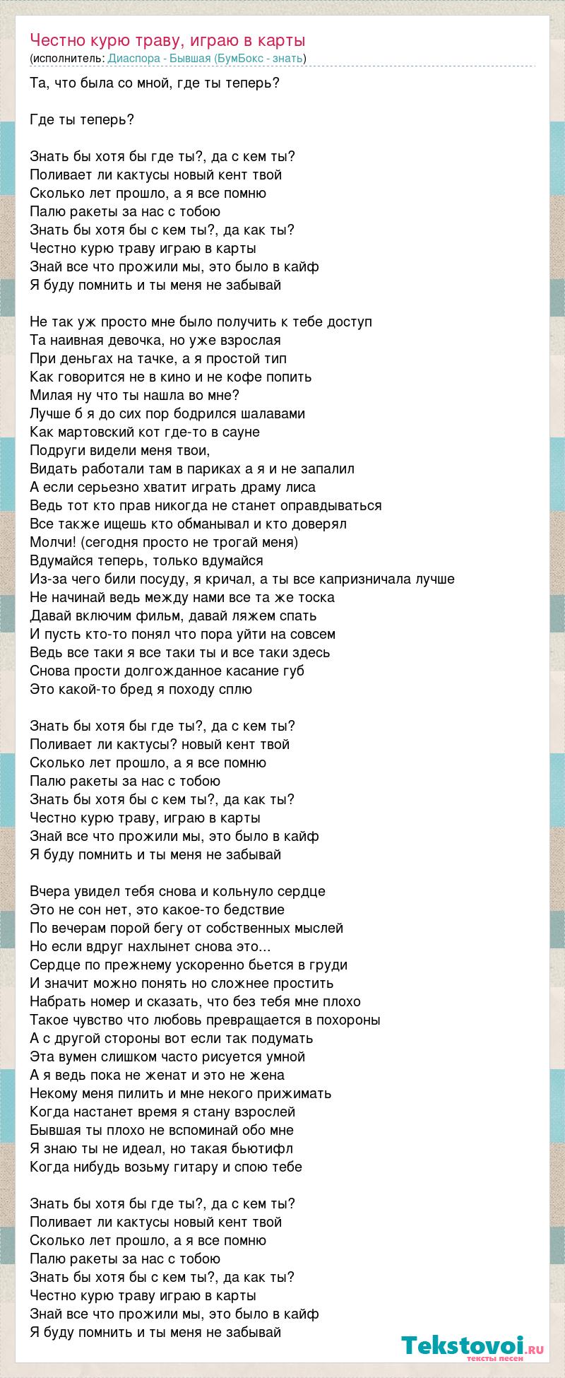 Та, что была со мной, где ты теперь? Где ты теперь? Знать бы хотя бы где ты?, да с кем ты? Поливает ли кактусы новый кент твой Сколько лет прошло, а я все помню Палю ракеты за нас с тобою Знать бы хотя бы с кем ты?, да как ты? Честно курю траву играю в карты Знай все что прожили мы, это было в кайф Я буду помнить и ты меня не забывай Не так уж просто мне было получить к тебе доступ Та наивная девочка, но уже взрослая При деньгах на тачке, а я простой тип Как говорится не в кино и не кофе попить Милая ну что ты нашла во мне? Лучше б я до сих пор бодрился шалавами Как мартовский кот где-то в сауне Подруги видели меня твои, Видать работали там в париках а я и не запалил А если серьезно хватит играть драму лиса Ведь тот кто прав никогда не станет оправдываться Все также ищешь кто обманывал и кто доверял Молчи! (сегодня просто не трогай меня) Вдумайся теперь, только вдумайся Из-за чего били посуду, я кричал, а ты все капризничала лучше Не начинай ведь между нами все та же тоска Давай включим фильм, давай ляжем спать И пусть кто-то понял что пора уйти на совсем Ведь все таки я все таки ты и все таки здесь Снова прости долгожданное касание губ Это какой-то бред я походу сплю Знать бы хотя бы где ты?, да с кем ты? Поливает ли кактусы? новый кент твой Сколько лет прошло, а я все помню Палю ракеты за нас с тобою Знать бы хотя бы с кем ты?, да как ты? Честно курю траву, играю в карты Знай все что прожили мы, это было в кайф Я буду помнить и ты меня не забывай Вчера увидел тебя снова и кольнуло сердце Это не сон нет, это какое-то бедствие По вечерам порой бегу от собственных мыслей Но если вдруг нахлынет снова это... Сердце по прежнему ускоренно бьется в груди И значит можно понять но сложнее простить Набрать номер и сказать, что без тебя мне плохо Такое чувство что любовь превращается в похороны А с другой стороны вот если так подумать Эта вумен слишком часто рисуется умной А я ведь пока не женат и это не жена Некому меня пилить и мне некого прижимать Когда настанет время я стану взрослей Бывшая ты плохо не вспоминай обо мне Я знаю ты не идеал, но такая бьютифл Когда нибудь возьму гитару и спою тебе Знать бы хотя бы где ты?, да с кем ты? Поливает ли кактусы новый кент твой Сколько лет прошло, а я все помню Палю ракеты за нас с тобою Знать бы хотя бы с кем ты?, да как ты? Честно курю траву играю в карты Знай все что прожили мы, это было в кайф Я буду помнить и ты меня не забывай