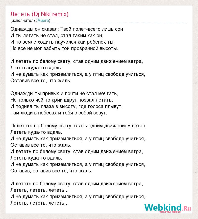 Однажды он сказал: Твой полет-всего лишь сон И ты летать не стал, стал таким как он, И по земле ходить научился как ребенок ты, Но все не мог забыть той прозрачной высоты. И лететь по белому свету, став одним движением ветра, Лететь куда-то вдаль. И не думать как приземлиться, а у птиц свободе учиться, Оставив все то, что жаль. Однажды ты привык и почти не стал мечтать, Но только чей-то крик вдруг позвал летать, И поднял ты глаза в высоту, где голоса плывут. Там люди в небесах и тебя с собой зовут. Полететь по белому свету, стать одним движением ветра, Лететь куда-то вдаль. И не думать как приземлиться, а у птиц свободе учиться, Оставив все то, что жаль. И лететь по белому свету, став одним движением ветра, Лететь куда-то вдаль. И не думать как приземлиться, а у птиц свободе учиться, Оставив, оставив все то, что жаль. И лететь по белому свету, став одним движением ветра, Лететь, лететь, лететь... И не думать как приземлиться, а у птиц свободе учиться, Лететь, лететь, лететь...