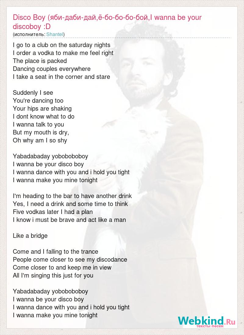 I go to a club on the saturday nights I order a vodka to make me feel right The place is packed Dancing couples everywhere I take a seat in the corner and stare Suddenly I see You're dancing too Your hips are shaking I dont know what to do I wanna talk to you But my mouth is dry, Oh why am I so shy Yabadabaday yoboboboboy I wanna be your disco boy I wanna dance with you and i hold you tight I wanna make you mine tonight I'm heading to the bar to have another drink Yes, I need a drink and some time to think Five vodkas later I had a plan I know i must be brave and act like a man Like a bridge Come and I falling to the trance People come closer to see my discodance Come closer to and keep me in view All I'm singing this just for you Yabadabaday yoboboboboy I wanna be your disco boy I wanna dance with you and i hold you tight I wanna make you mine tonight