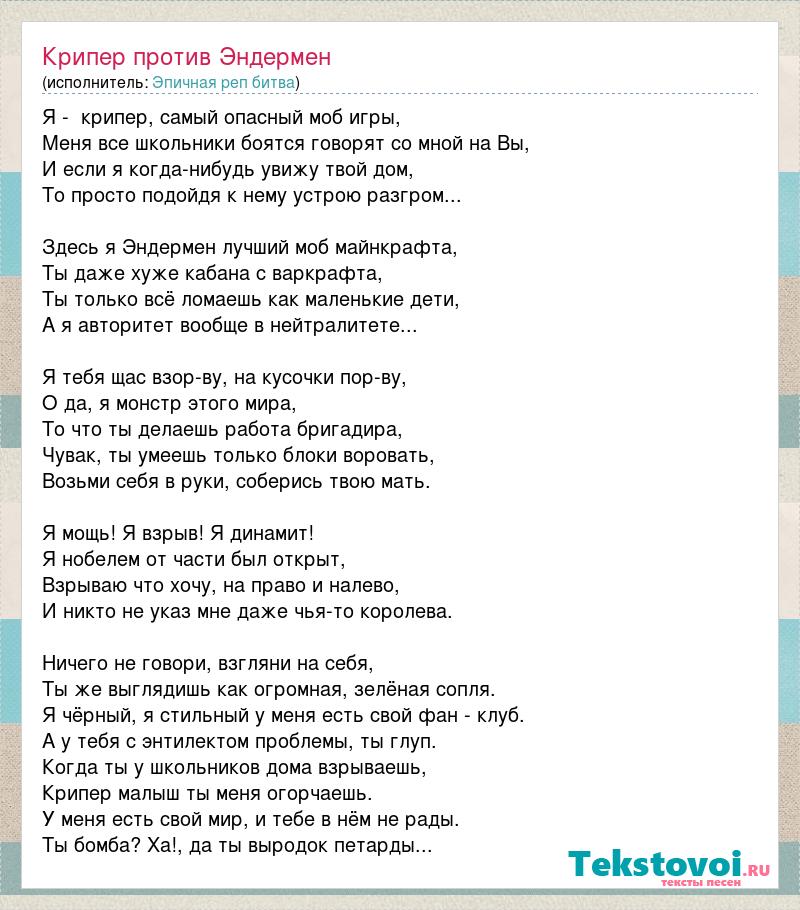 Я - крипер, самый опасный моб игры, Меня все школьники боятся говорят со мной на Вы, И если я когда-нибудь увижу твой дом, То просто подойдя к нему устрою разгром... Здесь я Эндермен лучший моб майнкрафта, Ты даже хуже кабана с варкрафта, Ты только всё ломаешь как маленькие дети, А я авторитет вообще в нейтралитете... Я тебя щас взор-ву, на кусочки пор-ву, О да, я монстр этого мира, То что ты делаешь работа бригадира, Чувак, ты умеешь только блоки воровать, Возьми себя в руки, соберись твою мать. Я мощь! Я взрыв! Я динамит! Я нобелем от части был открыт, Взрываю что хочу, на право и налево, И никто не указ мне даже чья-то королева. Ничего не говори, взгляни на себя, Ты же выглядишь как огромная, зелёная сопля. Я чёрный, я стильный у меня есть свой фан - клуб. А у тебя с энтилектом проблемы, ты глуп. Когда ты у школьников дома взрываешь, Крипер малыш ты меня огорчаешь. У меня есть свой мир, и тебе в нём не рады. Ты бомба? Ха!, да ты выродок петарды...