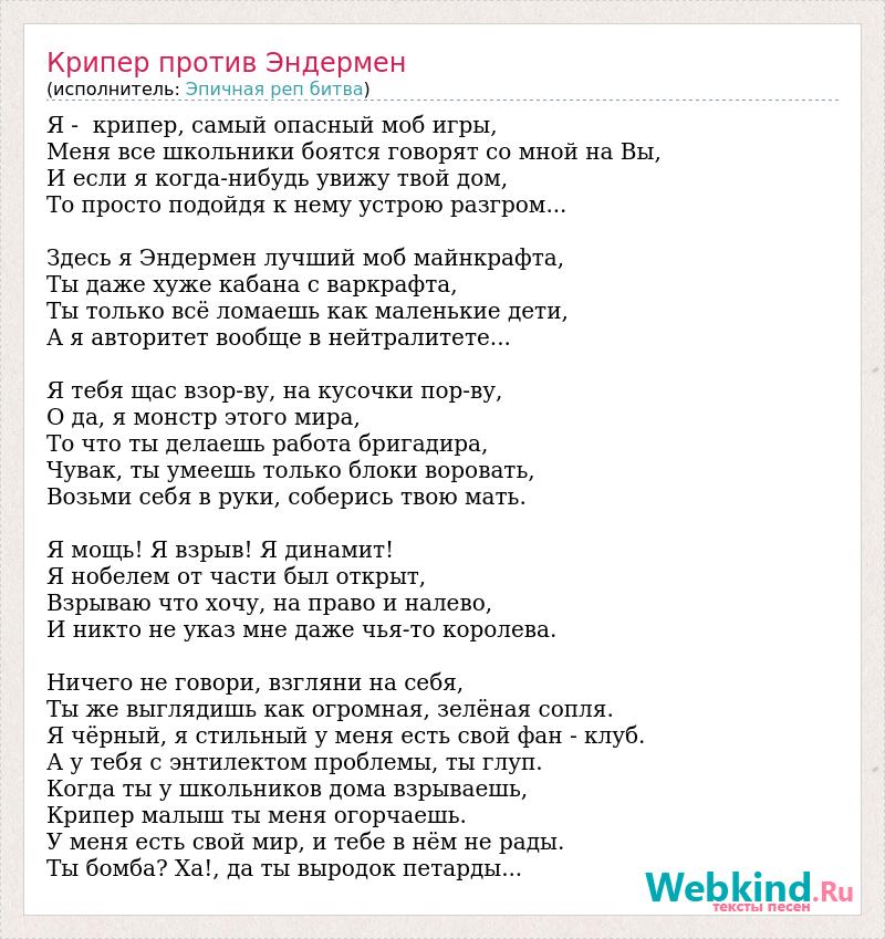 Я - крипер, самый опасный моб игры, Меня все школьники боятся говорят со мной на Вы, И если я когда-нибудь увижу твой дом, То просто подойдя к нему устрою разгром... Здесь я Эндермен лучший моб майнкрафта, Ты даже хуже кабана с варкрафта, Ты только всё ломаешь как маленькие дети, А я авторитет вообще в нейтралитете... Я тебя щас взор-ву, на кусочки пор-ву, О да, я монстр этого мира, То что ты делаешь работа бригадира, Чувак, ты умеешь только блоки воровать, Возьми себя в руки, соберись твою мать. Я мощь! Я взрыв! Я динамит! Я нобелем от части был открыт, Взрываю что хочу, на право и налево, И никто не указ мне даже чья-то королева. Ничего не говори, взгляни на себя, Ты же выглядишь как огромная, зелёная сопля. Я чёрный, я стильный у меня есть свой фан - клуб. А у тебя с энтилектом проблемы, ты глуп. Когда ты у школьников дома взрываешь, Крипер малыш ты меня огорчаешь. У меня есть свой мир, и тебе в нём не рады. Ты бомба? Ха!, да ты выродок петарды...