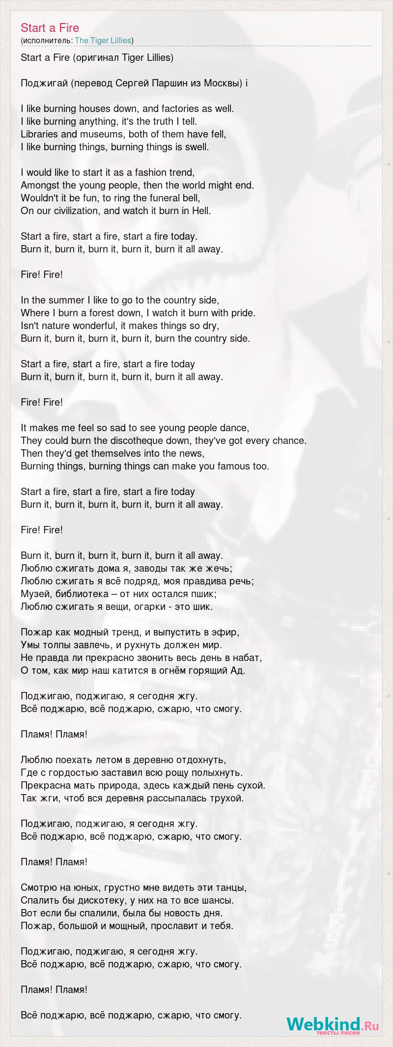 Start a Fire (оригинал Tiger Lillies) Поджигай (перевод Сергей Паршин из Москвы) i I like burning houses down, and factories as well. I like burning anything, it's the truth I tell. Libraries and museums, both of them have fell, I like burning things, burning things is swell. I would like to start it as a fashion trend, Amongst the young people, then the world might end. Wouldn't it be fun, to ring the funeral bell, On our civilization, and watch it burn in Hell. Start a fire, start a fire, start a fire today. Burn it, burn it, burn it, burn it, burn it all away. Fire! Fire! In the summer I like to go to the country side, Where I burn a forest down, I watch it burn with pride. Isn't nature wonderful, it makes things so dry, Burn it, burn it, burn it, burn it, burn the country side. Start a fire, start a fire, start a fire today Burn it, burn it, burn it, burn it, burn it all away. Fire! Fire! It makes me feel so sad to see young people dance, They could burn the discotheque down, they've got every chance. Then they'd get themselves into the news, Burning things, burning things can make you famous too. Start a fire, start a fire, start a fire today Burn it, burn it, burn it, burn it, burn it all away. Fire! Fire! Burn it, burn it, burn it, burn it, burn it all away. Люблю сжигать дома я, заводы так же жечь; Люблю сжигать я всё подряд, моя правдива речь; Музей, библиотека – от них остался пшик; Люблю сжигать я вещи, огарки - это шик. Пожар как модный тренд, и выпустить в эфир, Умы толпы завлечь, и рухнуть должен мир. Не правда ли прекрасно звонить весь день в набат, О том, как мир наш катится в огнём горящий Ад. Поджигаю, поджигаю, я сегодня жгу. Всё поджарю, всё поджарю, сжарю, что смогу. Пламя! Пламя! Люблю поехать летом в деревню отдохнуть, Где с гордостью заставил всю рощу полыхнуть. Прекрасна мать природа, здесь каждый пень сухой. Так жги, чтоб вся деревня рассыпалась трухой. Поджигаю, поджигаю, я сегодня жгу. Всё поджарю, всё поджарю, сжарю, что смогу. Пламя! Пламя! Смотрю на юных, грустно мне видеть эти танцы, Спалить бы дискотеку, у них на то все шансы. Вот если бы спалили, была бы новость дня. Пожар, большой и мощный, прославит и тебя. Поджигаю, поджигаю, я сегодня жгу. Всё поджарю, всё поджарю, сжарю, что смогу. Пламя! Пламя! Всё поджарю, всё поджарю, сжарю, что смогу.