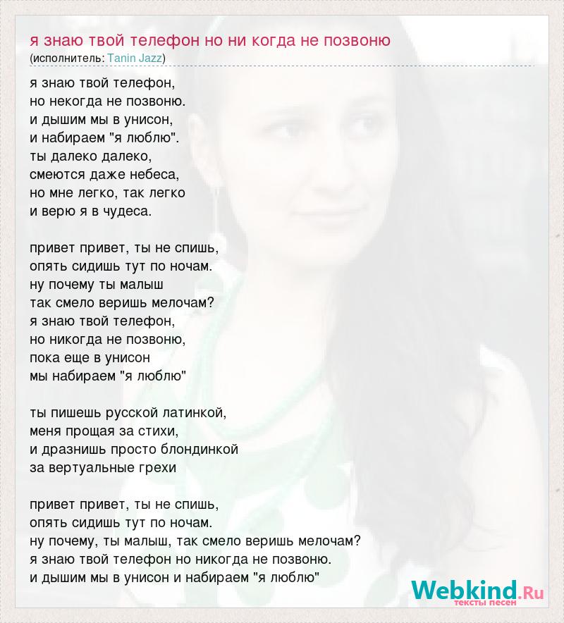 я знаю твой телефон, но некогда не позвоню. и дышим мы в унисон, и набираем "я люблю". ты далеко далеко, смеются даже небеса, но мне легко, так легко и верю я в чудеса. привет привет, ты не спишь, опять сидишь тут по ночам. ну почему ты малыш так смело веришь мелочам? я знаю твой телефон, но никогда не позвоню, пока еще в унисон мы набираем "я люблю" ты пишешь русской латинкой, меня прощая за стихи, и дразнишь просто блондинкой за вертуальные грехи привет привет, ты не спишь, опять сидишь тут по ночам. ну почему, ты малыш, так смело веришь мелочам? я знаю твой телефон но никогда не позвоню. и дышим мы в унисон и набираем "я люблю"