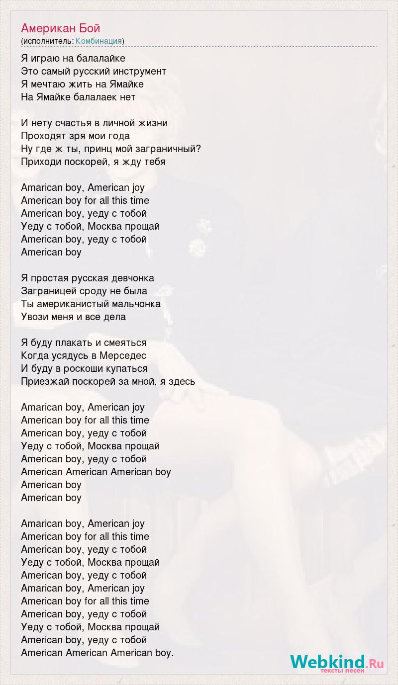 Я играю на балалайке Это самый русский инструмент Я мечтаю жить на Ямайке На Ямайке балалаек нет И нету счастья в личной жизни Проходят зря мои года Ну где ж ты, принц мой заграничный? Приходи поскорей, я жду тебя Amarican boy, American joy American boy for all this time American boy, уеду с тобой Уеду с тобой, Москва прощай American boy, уеду с тобой American boy Я простая русская девчонка Заграницей сроду не была Ты американистый мальчонка Увози меня и все дела Я буду плaкать и смеяться Когда усядусь в Mерседес И буду в роскоши купаться Приезжай поскорей за мной, я здесь Amarican boy, American joy American boy for all this time American boy, уеду с тобой Уеду с тобой, Москва прощай American boy, уеду с тобой American American American boy American boy American boy Amarican boy, American joy American boy for all this time American boy, уеду с тобой Уеду с тобой, Москва прощай American boy, уеду с тобой Amarican boy, American joy American boy for all this time American boy, уеду с тобой Уеду с тобой, Москва прощай American boy, уеду с тобой American American American boy.