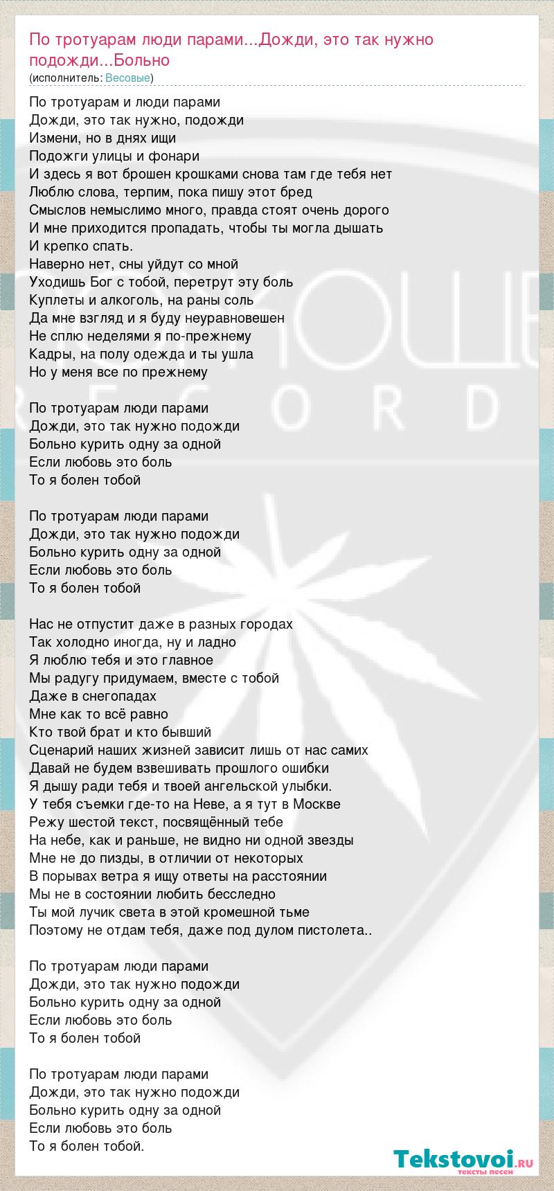 По тротуарам и люди парами Дожди, это так нужно, подожди Измени, но в днях ищи Подожги улицы и фонари И здесь я вот брошен крошками снова там где тебя нет Люблю слова, терпим, пока пишу этот бред Смыслов немыслимо много, правда стоят очень дорого И мне приходится пропадать, чтобы ты могла дышать И крепко спать. Наверно нет, сны уйдут со мной Уходишь Бог с тобой, перетрут эту боль Куплеты и алкоголь, на раны соль Да мне взгляд и я буду неуравновешен Не сплю неделями я по-прежнему Кадры, на полу одежда и ты ушла Но у меня все по прежнему По тротуарам люди парами Дожди, это так нужно подожди Больно курить одну за одной Если любовь это боль То я болен тобой По тротуарам люди парами Дожди, это так нужно подожди Больно курить одну за одной Если любовь это боль То я болен тобой Нас не отпустит даже в разных городах Так холодно иногда, ну и ладно Я люблю тебя и это главное Мы радугу придумаем, вместе с тобой Даже в снегопадах Мне как то всё равно Кто твой брат и кто бывший Сценарий наших жизней зависит лишь от нас самих Давай не будем взвешивать прошлого ошибки Я дышу ради тебя и твоей ангельской улыбки. У тебя съемки где-то на Неве, а я тут в Москве Режу шестой текст, посвящённый тебе На небе, как и раньше, не видно ни одной звезды Мне не до пизды, в отличии от некоторых В порывах ветра я ищу ответы на расстоянии Мы не в состоянии любить бесследно Ты мой лучик света в этой кромешной тьме Поэтому не отдам тебя, даже под дулом пистолета.. По тротуарам люди парами Дожди, это так нужно подожди Больно курить одну за одной Если любовь это боль То я болен тобой По тротуарам люди парами Дожди, это так нужно подожди Больно курить одну за одной Если любовь это боль То я болен тобой.