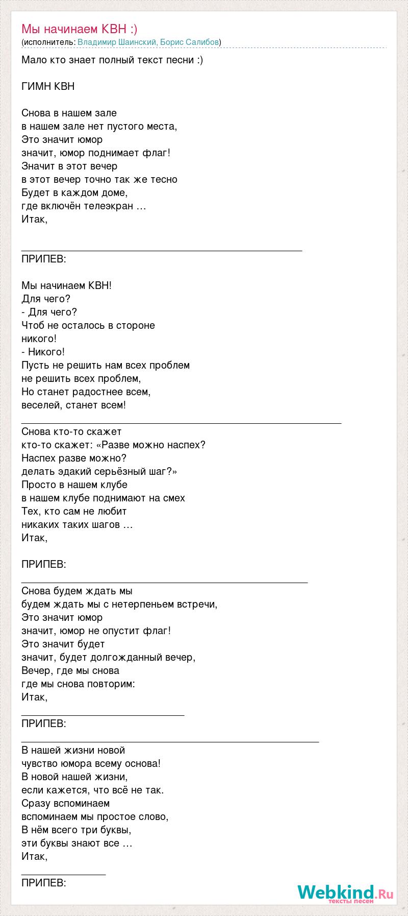 Мало кто знает полный текст песни :) ГИМН КВН Снова в нашем зале в нашем зале нет пустого места, Это значит юмор значит, юмор поднимает флаг! Значит в этот вечер в этот вечер точно так же тесно Будет в каждом доме, где включён телеэкран … Итак, __________________________________________________ ПРИПЕВ: Мы начинаем КВН! Для чего? - Для чего? Чтоб не осталось в стороне никого! - Никого! Пусть не решить нам всех проблем не решить всех проблем, Но станет радостнее всем, веселей, станет всем! _________________________________________________________ Снова кто-то скажет кто-то скажет: «Разве можно наспех? Наспех разве можно? делать эдакий серьёзный шаг?» Просто в нашем клубе в нашем клубе поднимают на смех Тех, кто сам не любит никаких таких шагов … Итак, ПРИПЕВ: ___________________________________________________ Снова будем ждать мы будем ждать мы с нетерпеньем встречи, Это значит юмор значит, юмор не опустит флаг! Это значит будет значит, будет долгожданный вечер, Вечер, где мы снова где мы снова повторим: Итак, _____________________________ ПРИПЕВ: _____________________________________________________ В нашей жизни новой чувство юмора всему основа! В новой нашей жизни, если кажется, что всё не так. Сразу вспоминаем вспоминаем мы простое слово, В нём всего три буквы, эти буквы знают все … Итак, _______________ ПРИПЕВ: