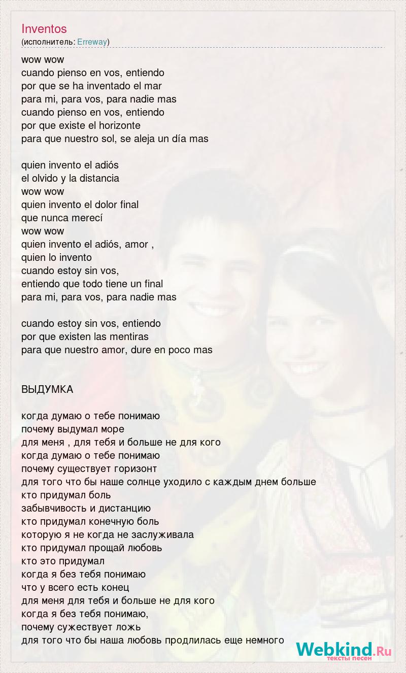 wow wow cuando pienso en vos, entiendo por que se ha inventado el mar para mi, para vos, para nadie mas cuando pienso en vos, entiendo por que existe el horizonte para que nuestro sol, se aleja un día mas quien invento el adiós el olvido y la distancia wow wow quien invento el dolor final que nunca merecí wow wow quien invento el adiós, amor , quien lo invento cuando estoy sin vos, entiendo que todo tiene un final para mi, para vos, para nadie mas cuando estoy sin vos, entiendo por que existen las mentiras para que nuestro amor, dure en poco mas ВЫДУМКА когда думаю о тебе понимаю почему выдумал море для меня , для тебя и больше не для кого когда думаю о тебе понимаю почему существует горизонт для того что бы наше солнце уходило с каждым днем больше кто придумал боль забывчивость и дистанцию кто придумал конечную боль которую я не когда не заслуживала кто придумал прощай любовь кто это придумал когда я без тебя понимаю что у всего есть конец для меня для тебя и больше не для кого когда я без тебя понимаю, почему сужествует ложь для того что бы наша любовь продлилась еще немного