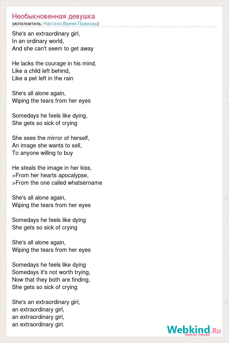 She's an extraordinary girl, In an ordinary world, And she can't seem to get away He lacks the courage in his mind, Like a child left behind, Like a pet left in the rain She's all alone again, Wiping the tears from her eyes Somedays he feels like dying, She gets so sick of crying She sees the mirror of herself, An image she wants to sell, To anyone willing to buy He steals the image in her kiss, >From her hearts apocalypse, >From the one called whatsername She's all alone again, Wiping the tears from her eyes Somedays he feels like dying She gets so sick of crying She's all alone again, Wiping the tears from her eyes Somedays he feels like dying Somedays it's not worth trying, Now that they both are finding, She gets so sick of crying She's an extraordinary girl, an extraordinary girl, an extraordinary girl, an extraordinary girl.