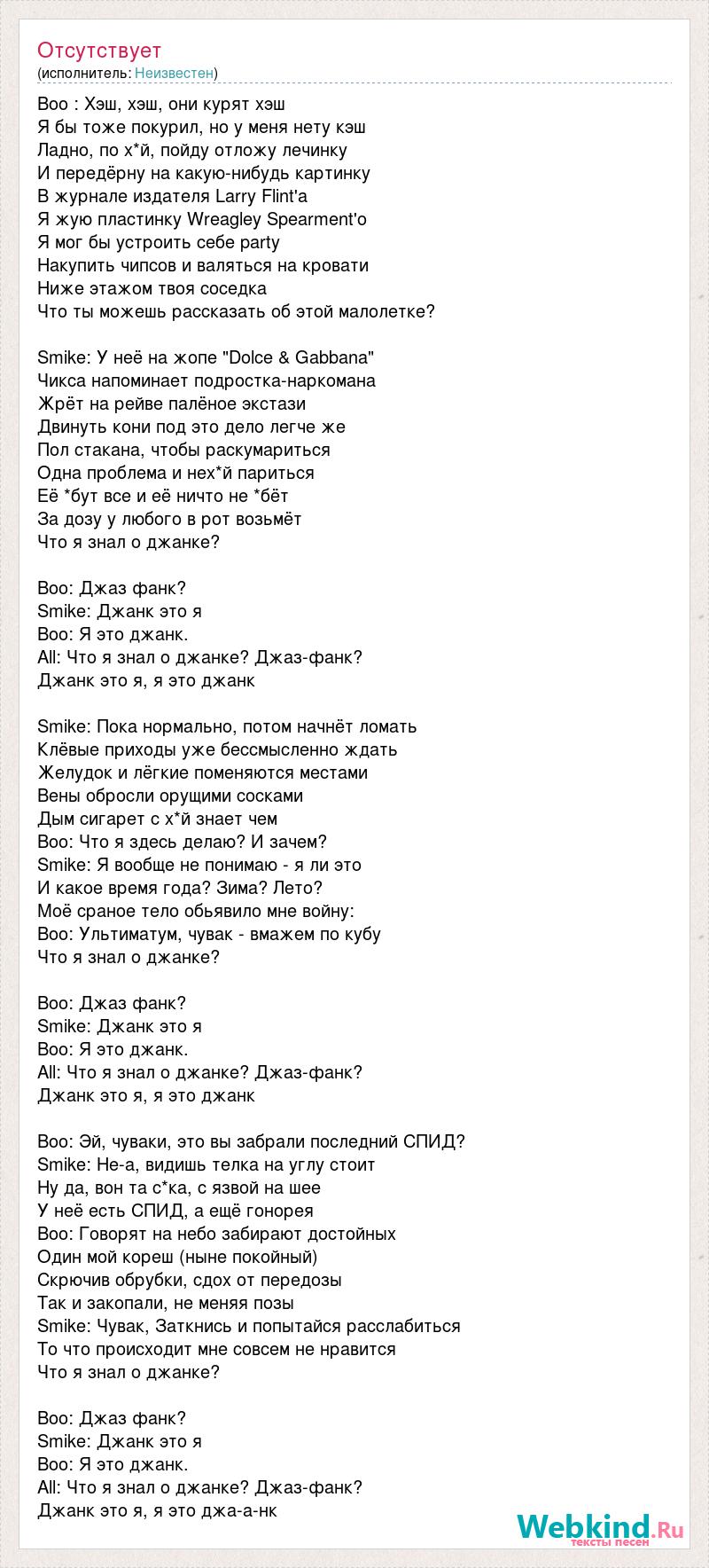 Boo : Хэш, хэш, они курят хэш Я бы тоже покурил, но у меня нету кэш Ладно, по х*й, пойду отложу лечинку И передёрну на какую-нибудь картинку В журнале издателя Larry Flint'a Я жую пластинку Wreagley Spearment'o Я мог бы устроить себе party Накупить чипсов и валяться на кровати Ниже этажом твоя соседка Что ты можешь рассказать об этой малолетке? Smike: У неё на жопе "Dolce & Gabbana" Чикса напоминает подростка-наркомана Жрёт на рейве палёное экстази Двинуть кони под это дело легче же Пол стакана, чтобы раскумариться Одна проблема и нех*й париться Её *бут все и её ничто не *бёт За дозу у любого в рот возьмёт Что я знал о джанке? Boo: Джаз фанк? Smike: Джанк это я Boo: Я это джанк. All: Что я знал о джанке? Джаз-фанк? Джанк это я, я это джанк Smike: Пока нормально, потом начнёт ломать Клёвые приходы уже бессмысленно ждать Желудок и лёгкие поменяются местами Вены обросли орущими сосками Дым сигарет с х*й знает чем Boo: Что я здесь делаю? И зачем? Smike: Я вообще не понимаю - я ли это И какое время года? Зима? Лето? Моё сраное тело обьявило мне войну: Boo: Ультиматум, чувак - вмажем по кубу Что я знал о джанке? Boo: Джаз фанк? Smike: Джанк это я Boo: Я это джанк. All: Что я знал о джанке? Джаз-фанк? Джанк это я, я это джанк Boo: Эй, чуваки, это вы забрали последний СПИД? Smike: Не-а, видишь телка на углу стоит Ну да, вон та с*ка, с язвой на шее У неё есть СПИД, а ещё гонорея Boo: Говорят на небо забирают достойных Один мой кореш (ныне покойный) Скрючив обрубки, сдох от передозы Так и закопали, не меняя позы Smike: Чувак, Заткнись и попытайся расслабиться То что происходит мне совсем не нравится Что я знал о джанке? Boo: Джаз фанк? Smike: Джанк это я Boo: Я это джанк. All: Что я знал о джанке? Джаз-фанк? Джанк это я, я это джа-а-нк