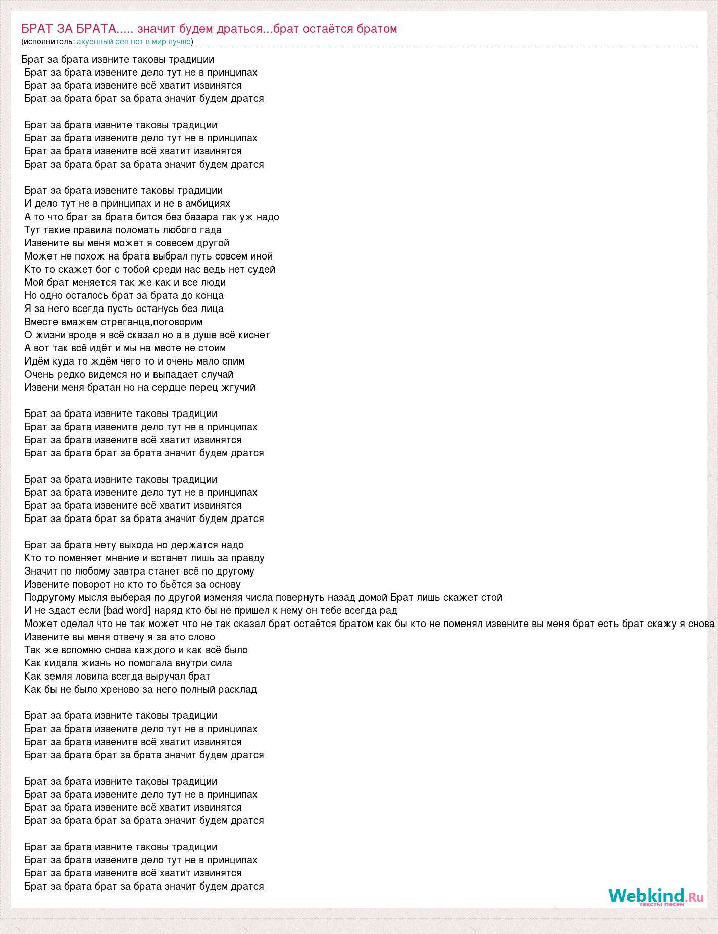 Брат за брата извните таковы традиции Брат за брата извените дело тут не в принципах Брат за брата извените всё хватит извинятся Брат за брата брат за брата значит будем дратся Брат за брата извните таковы традиции Брат за брата извените дело тут не в принципах Брат за брата извените всё хватит извинятся Брат за брата брат за брата значит будем дратся Брат за брата извените таковы традиции И дело тут не в принципах и не в амбициях А то что брат за брата бится без базара так уж надо Тут такие правила поломать любого гада Извените вы меня может я совесем другой Может не похож на брата выбрал путь совсем иной Кто то скажет бог с тобой среди нас ведь нет судей Мой брат меняется так же как и все люди Но одно осталось брат за брата до конца Я за него всегда пусть останусь без лица Вместе вмажем стреганца,поговорим О жизни вроде я всё сказал но а в душе всё киснет А вот так всё идёт и мы на месте не стоим Идём куда то ждём чего то и очень мало спим Очень редко видемся но и выпадает случай Извени меня братан но на сердце перец жгучий Брат за брата извните таковы традиции Брат за брата извените дело тут не в принципах Брат за брата извените всё хватит извинятся Брат за брата брат за брата значит будем дратся Брат за брата извните таковы традиции Брат за брата извените дело тут не в принципах Брат за брата извените всё хватит извинятся Брат за брата брат за брата значит будем дратся Брат за брата нету выхода но держатся надо Кто то поменяет мнение и встанет лишь за правду Значит по любому завтра станет всё по другому Извените поворот но кто то бьётся за основу Подругому мысля выберая по другой изменяя числа повернуть назад домой Брат лишь скажет стой И не здаст если [bad word] наряд кто бы не пришел к нему он тебе всегда рад Может сделал что не так может что не так сказал брат остаётся братом как бы кто не поменял извените вы меня брат есть брат скажу я снова Извените вы меня отвечу я за это слово Так же вспомню снова каждого и как всё было Как кидала жизнь но помогала внутри сила Как земля ловила всегда выручал брат Как бы не было хреново за него полный расклад Брат за брата извните таковы традиции Брат за брата извените дело тут не в принципах Брат за брата извените всё хватит извинятся Брат за брата брат за брата значит будем дратся Брат за брата извните таковы традиции Брат за брата извените дело тут не в принципах Брат за брата извените всё хватит извинятся Брат за брата брат за брата значит будем дратся Брат за брата извните таковы традиции Брат за брата извените дело тут не в принципах Брат за брата извените всё хватит извинятся Брат за брата брат за брата значит будем дратся