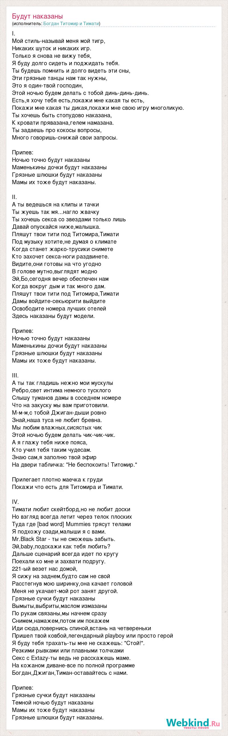 I. Мой стиль-называй меня мой тигр, Никаких шуток и никаких игр. Только я снова не вижу тебя, Я буду долго сидеть и поджидать тебя. Ты будешь помнить и долго видеть эти сны, Эти грязные танцы нам так нужны, Это я один-твой господин, Этой ночью будем делать с тобой динь-динь-динь. Есть,я хочу тебя есть,покажи мне какая ты есть, Покажи мне какая ты дикая,покажи мне свою игру многоликую. Ты хочешь быть стопудово наказана, К кровати прявазана,гелем намазана. Ты задаешь про кокосы вопросы, Много говоришь-снижай свои запросы. Припев: Ночью точно будут наказаны Маменькины дочки будут наказаны Грязные шлюшки будут наказаны Мамы их тоже будут наказаны. II. А ты ведешься на клипы и тачки Ты жуешь так мя...нагло жвачку Ты хочешь секса со звездами только лишь Давай опускайся ниже,малышка. Пляшут твои тити под Титомира,Тимати Под музыку хотите,не думая о климате Когда станет жарко-трусики снимете Кто захочет секса-ноги раздвинете. Видите,они готовы на что угодно В голове мутно,выглядят модно Эй,Бо,сегодня вечер обеспечен нам Когда вокруг дым и так много дам. Пляшут твои тити под Титомира,Тимати Дамы войдите-секьюрити выйдите Освободите номера лучших отелей Здесь наказаны будут модели. Припев: Ночью точно будут наказаны Маменькины дочки будут наказаны Грязные шлюшки будут наказаны Мамы их тоже будут наказаны. III. А ты так гладишь нежно мои мускулы Ребро,свет интима немного тусклого Слышу туманов дамы в соседнем номере Что на закуску мы вам приготовили. М-м-м,с тобой Джиган-дыши ровно Знай,наша туса не любит бревна. Мы любим влажных,сисястых чик Этой ночью будем делать чик-чик-чик. А я глажу тебя ниже пояса, Кто учил тебя таким чудесам. Знаю сам,я заполню твой эфир На двери табличка: "Не беспокоить! Титомир." Прилегает плотно маечка к груди Покажи что есть для Титомира и Тимати. IV. Тимати любит скейтборд,но не любит доски Но взгляд всегда летит через телок плоских Туда где [bad word] Mummies трясут телами Я подхожу сзади,малыши я с вами. Mr.Black Star - ты не сможешь забыть. Эй,baby,подскажи как тебя любить? Дальше сценарий всегда идет по кругу Поехали ко мне и захвати подругу. 221-ый везет нас домой, Я сижу на заднем,будто сам не свой Расстегнув мою ширинку,она качает головой Меня не укачает-мой рот занят другой. Грязные сучки будут наказаны Вымыты,выбриты,маслом измазаны По рукам связаны,мы начнем сразу Снимем,намажем,потом им покажем Иди сюда,повернись спиной,встань на четвереньки Пришел твой ковбой,легендарный playboy или просто герой Я буду тебя трахать-ты мне не скажешь: "Стой!". Резкими рывками или плавными толчками Секс с Extazy-ты ведь не расскажешь маме. На кожаном диване-все по полной программе Богдан,Джиган,Тиман-оставайтесь с нами. Припев: Грязные сучки будут наказаны Темной ночью будут наказаны Мамы их тоже будут наказаны Грязные шлюшки будут наказаны.