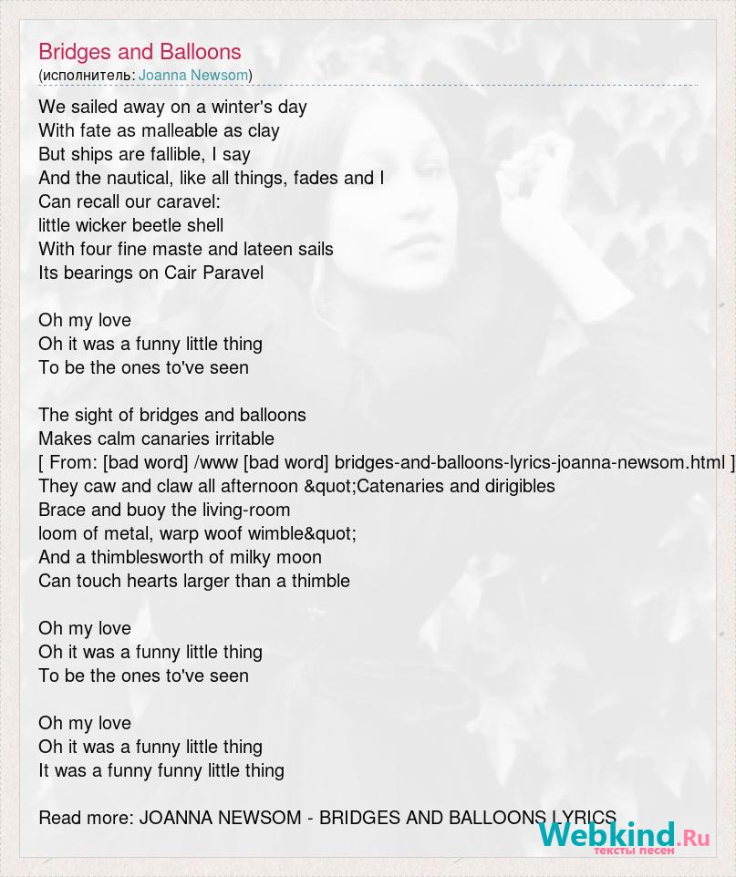 We sailed away on a winter's day With fate as malleable as clay But ships are fallible, I say And the nautical, like all things, fades and I Can recall our caravel: little wicker beetle shell With four fine maste and lateen sails Its bearings on Cair Paravel Oh my love Oh it was a funny little thing To be the ones to've seen The sight of bridges and balloons Makes calm canaries irritable [ From: [bad word] /www [bad word] bridges-and-balloons-lyrics-joanna-newsom.html ] They caw and claw all afternoon "Catenaries and dirigibles Brace and buoy the living-room loom of metal, warp woof wimble" And a thimblesworth of milky moon Can touch hearts larger than a thimble Oh my love Oh it was a funny little thing To be the ones to've seen Oh my love Oh it was a funny little thing It was a funny funny little thing Read more: JOANNA NEWSOM - BRIDGES AND BALLOONS LYRICS