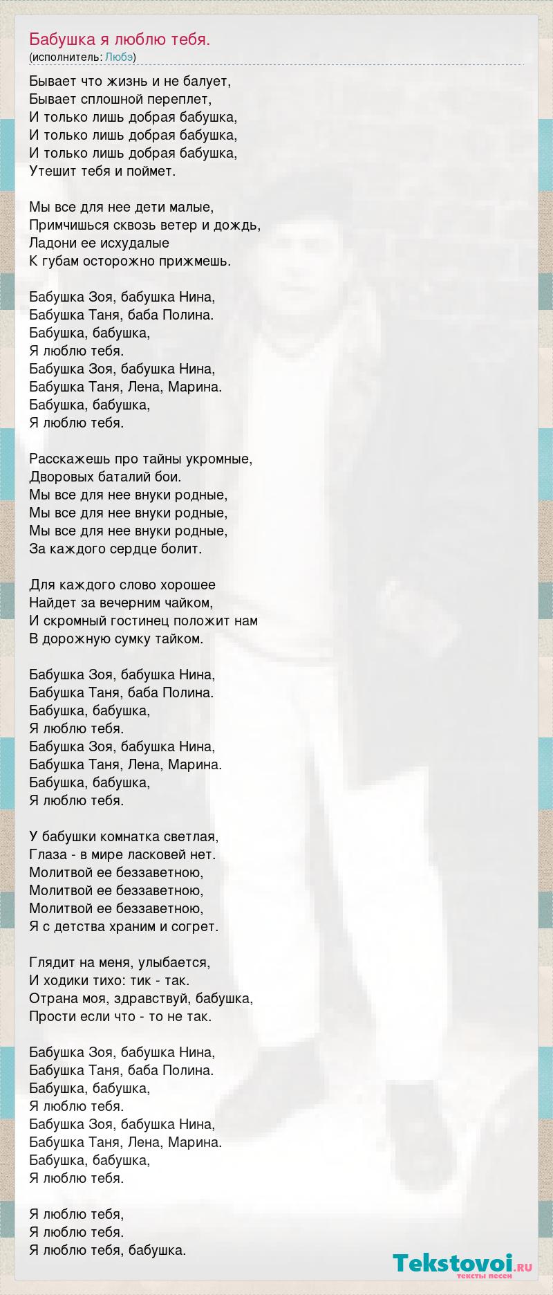 Бывает что жизнь и не балует, Бывает сплошной переплет, И только лишь добрая бабушка, И только лишь добрая бабушка, И только лишь добрая бабушка, Утешит тебя и поймет. Мы все для нее дети малые, Примчишься сквозь ветер и дождь, Ладони ее исхудалые К губам осторожно прижмешь. Бабушка Зоя, бабушка Нина, Бабушка Таня, баба Полина. Бабушка, бабушка, Я люблю тебя. Бабушка Зоя, бабушка Нина, Бабушка Таня, Лена, Марина. Бабушка, бабушка, Я люблю тебя. Расскажешь про тайны укромные, Дворовых баталий бои. Мы все для нее внуки родные, Мы все для нее внуки родные, Мы все для нее внуки родные, За каждого сердце болит. Для каждого слово хорошее Найдет за вечерним чайком, И скромный гостинец положит нам В дорожную сумку тайком. Бабушка Зоя, бабушка Нина, Бабушка Таня, баба Полина. Бабушка, бабушка, Я люблю тебя. Бабушка Зоя, бабушка Нина, Бабушка Таня, Лена, Марина. Бабушка, бабушка, Я люблю тебя. У бабушки комнатка светлая, Глаза - в мире ласковей нет. Молитвой ее беззаветною, Молитвой ее беззаветною, Молитвой ее беззаветною, Я с детства храним и согрет. Глядит на меня, улыбается, И ходики тихо: тик - так. Отрана моя, здравствуй, бабушка, Прости если что - то не так. Бабушка Зоя, бабушка Нина, Бабушка Таня, баба Полина. Бабушка, бабушка, Я люблю тебя. Бабушка Зоя, бабушка Нина, Бабушка Таня, Лена, Марина. Бабушка, бабушка, Я люблю тебя. Я люблю тебя, Я люблю тебя. Я люблю тебя, бабушка.