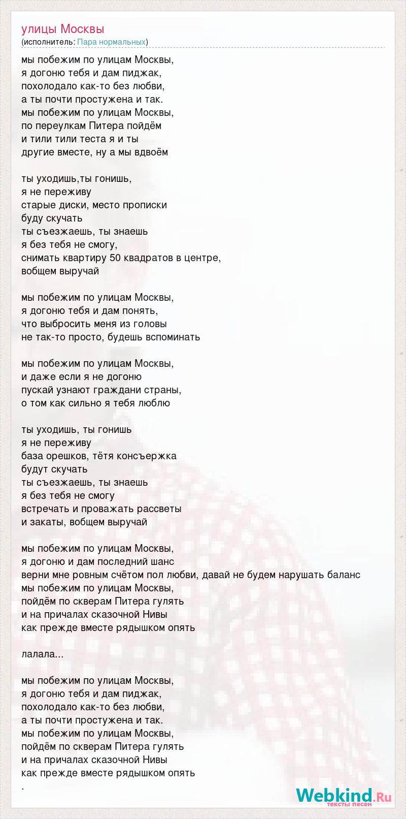 мы побежим по улицам Москвы, я догоню тебя и дам пиджак, похолодало как-то без любви, а ты почти простужена и так. мы побежим по улицам Москвы, по переулкам Питера пойдём и тили тили теста я и ты другие вместе, ну а мы вдвоём ты уходишь,ты гонишь, я не переживу старые диски, место прописки буду скучать ты съезжаешь, ты знаешь я без тебя не смогу, снимать квартиру 50 квадратов в центре, вобщем выручай мы побежим по улицам Москвы, я догоню тебя и дам понять, что выбросить меня из головы не так-то просто, будешь вспоминать мы побежим по улицам Москвы, и даже если я не догоню пускай узнают граждани страны, о том как сильно я тебя люблю ты уходишь, ты гонишь я не переживу база орешков, тётя консъержка будут скучать ты съезжаешь, ты знаешь я без тебя не смогу встречать и проважать рассветы и закаты, вобщем выручай мы побежим по улицам Москвы, я догоню и дам последний шанс верни мне ровным счётом пол любви, давай не будем нарушать баланс мы побежим по улицам Москвы, пойдём по скверам Питера гулять и на причалах сказочной Нивы как прежде вместе рядышком опять лалала... мы побежим по улицам Москвы, я догоню тебя и дам пиджак, похолодало как-то без любви, а ты почти простужена и так. мы побежим по улицам Москвы, пойдём по скверам Питера гулять и на причалах сказочной Нивы как прежде вместе рядышком опять .