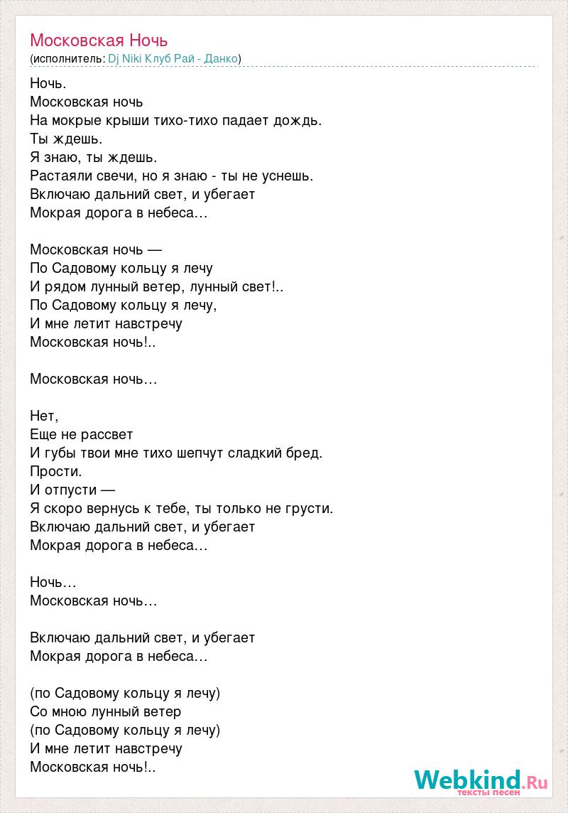 Ночь. Московская ночь На мокрые крыши тихо-тихо падает дождь. Ты ждешь. Я знаю, ты ждешь. Растаяли свечи, но я знаю - ты не уснешь. Включаю дальний свет, и убегает Мокрая дорога в небеса… Московская ночь — По Садовому кольцу я лечу И рядом лунный ветер, лунный свет!.. По Садовому кольцу я лечу, И мне летит навстречу Московская ночь!.. Московская ночь… Нет, Еще не рассвет И губы твои мне тихо шепчут сладкий бред. Прости. И отпусти — Я скоро вернусь к тебе, ты только не грусти. Включаю дальний свет, и убегает Мокрая дорога в небеса… Ночь… Московская ночь… Включаю дальний свет, и убегает Мокрая дорога в небеса… (по Садовому кольцу я лечу) Со мною лунный ветер (по Садовому кольцу я лечу) И мне летит навстречу Московская ночь!..
