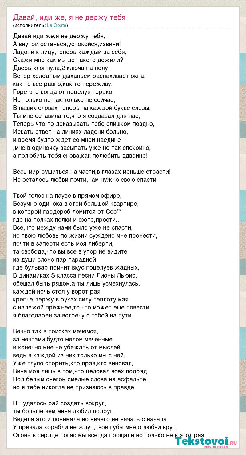 Давай иди же,я не держу тебя, А внутри останься,успокойся,извини! Ладони к лицу,теперь каждый за себя, Скажи мне как мы до такого дожили? Дверь хлопнула,2 ключа на полу Ветер холодным дыханьем распахивает окна, как то все равно,как то переживу, Горе-это когда от поцелуя горько, Но только не так,только не сейчас, В наших словах теперь на каждой букве слезы, Ты мне оставила то,что я создавал для нас, Теперь что-то доказывать тебе слишком поздно, Искать ответ на линиях ладони больно, и время будто ждет со мной наедине ,мне в одиночку засыпать уже не так спокойно, а полюбить тебя снова,как полюбить вдвойне! Весь мир рушиться на части,в глазах меньше страсти! Не осталось любви почти,нам нужно свою спасти. Твой голос на паузе в прямом эфире, Безумно одинока в этой большой квартире, в которой гардероб ломится от Сес** где на полках полки и фото,прости.. Все,что между нами было уже не спасти, но твою любовь по жизни суждено мне пронести, почти в заперти есть моя либерти, та свобода,что вы все в упор не видите из души слоно пар парадной где бульвар помнит вкус поцелуев жадных, В динамиках S класса песни Лионы Льюис, обещал быть рядом,а ты лишь усмехнулась, каждой ночь стоя у ворот рая крепче держу в руках силу теплоту мая с надежой прежнее,то что может еще повести я благодарен за встречу с тобой на пути. Вечно так в поисках мечемся, за мечтами,будто мелом меченные и конечно мне не убежать от мыслей ведь в каждой из них только мы с ней, Уже глупо спорить,кто прав,кто виноват, Вина моя лишь в том,что целовал всех подряд Под белым снегом смелые слова на асфальте , но я тебе никогда не признаюсь в правде. НЕ удалось рай создать вокруг, ты больше чем меня любил подруг, Видела это и понимала,но ничего не начать с начала. У причала корабли не ждут,твои губы мне о любви врут, Огонь в сердце погас,мы всегда прощали,но только не в этот раз