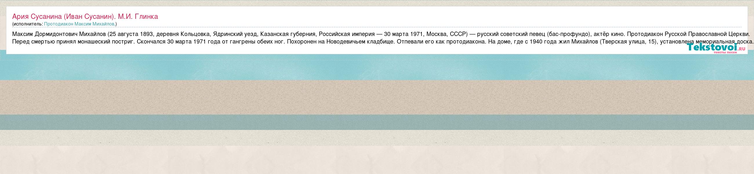 Макси́м Дормидо́нтович Миха́йлов (25 августа 1893, деревня Кольцовка, Ядринский уезд, Казанская губерния, Российская империя — 30 марта 1971, Москва, СССР) — русский советский певец (бас-профундо), актёр кино. Протодиакон Русской Православной Церкви. Перед смертью принял монашеский постриг. Скончался 30 марта 1971 года от гангрены обеих ног. Похоронен на Новодевичьем кладбище. Отпевали его как протодиакона. На доме, где с 1940 года жил Михайлов (Тверская улица, 15), установлена мемориальная доска.