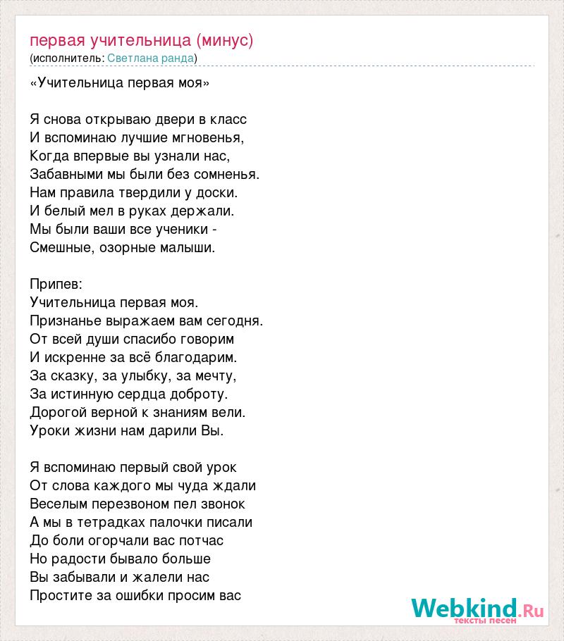 «Учительница первая моя» Я снова открываю двери в класс И вспоминаю лучшие мгновенья, Когда впервые вы узнали нас, Забавными мы были без сомненья. Нам правила твердили у доски. И белый мел в руках держали. Мы были ваши все ученики - Смешные, озорные малыши. Припев: Учительница первая моя. Признанье выражаем вам сегодня. От всей души спасибо говорим И искренне за всё благодарим. За сказку, за улыбку, за мечту, За истинную сердца доброту. Дорогой верной к знаниям вели. Уроки жизни нам дарили Вы. Я вспоминаю первый свой урок От слова каждого мы чуда ждали Веселым перезвоном пел звонок А мы в тетрадках палочки писали До боли огорчали вас потчас Но радости бывало больше Вы забывали и жалели нас Простите за ошибки просим вас